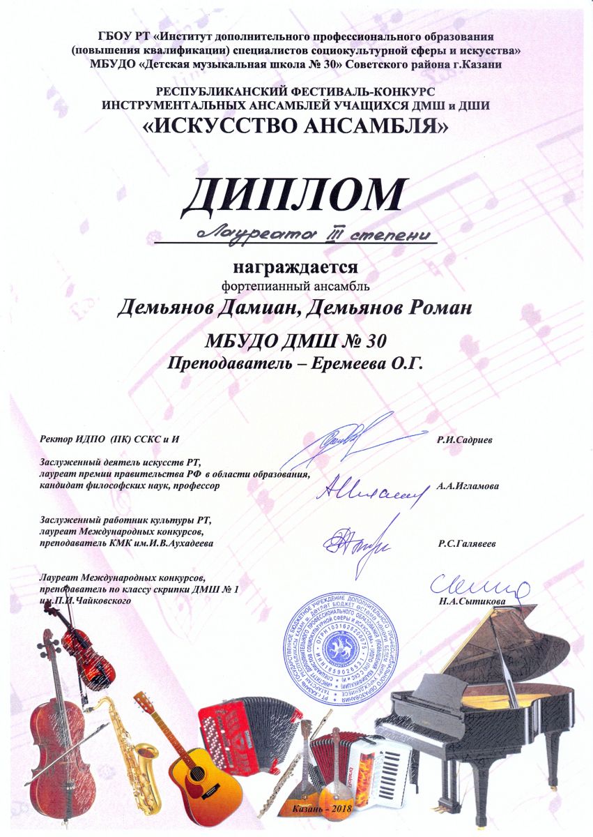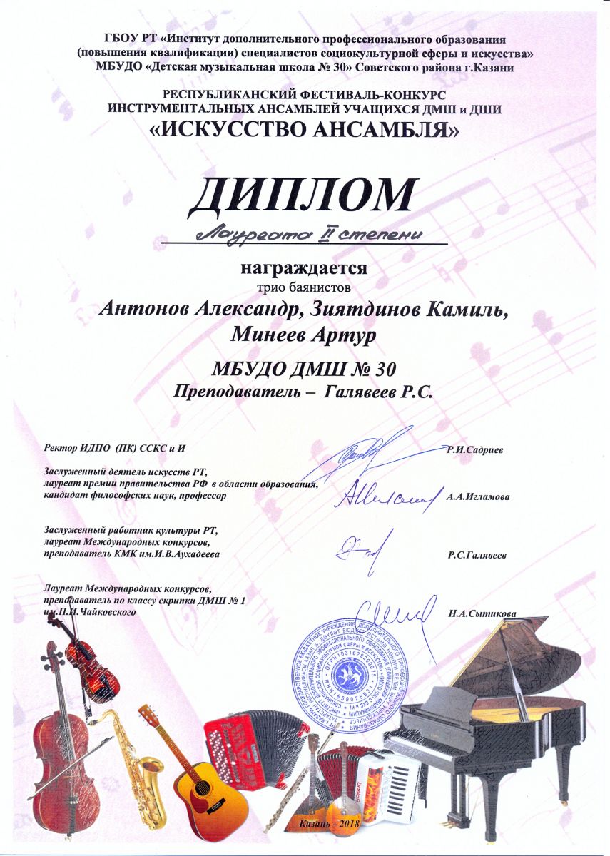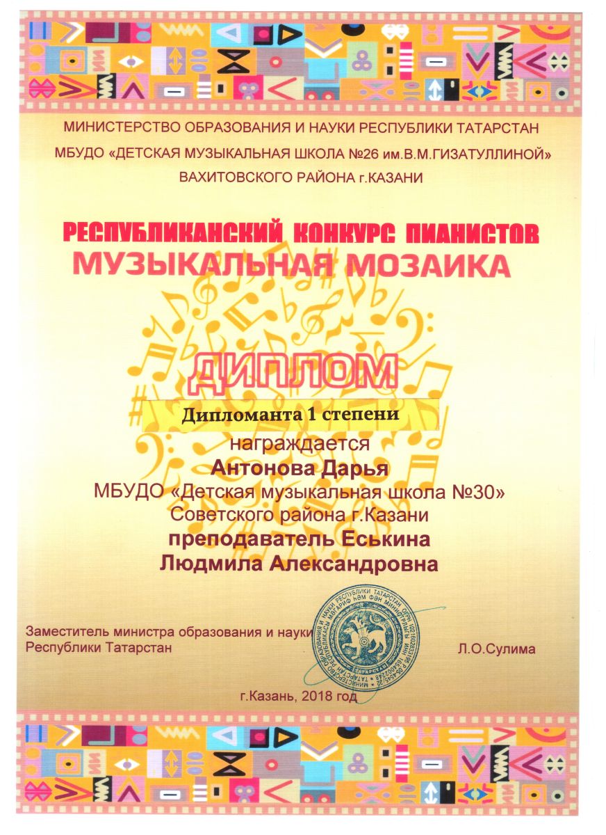 Республиканский конкурс пианистов "Музыкальная мозаика" - Антонова Дарья - диплом I степени