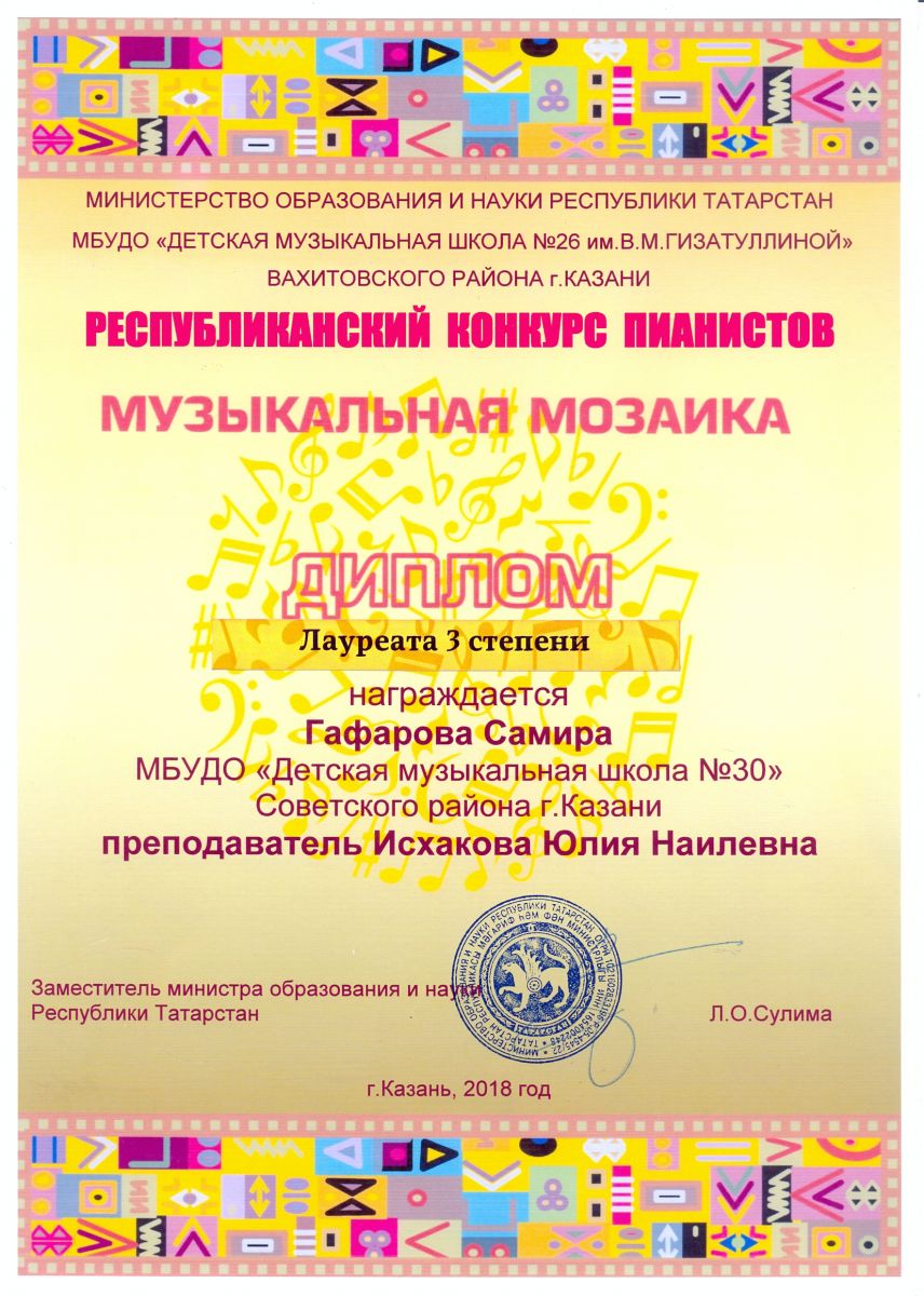 Республиканский конкурс пианистов "Музыкальная мозаика" - Гафарова Самира - III место