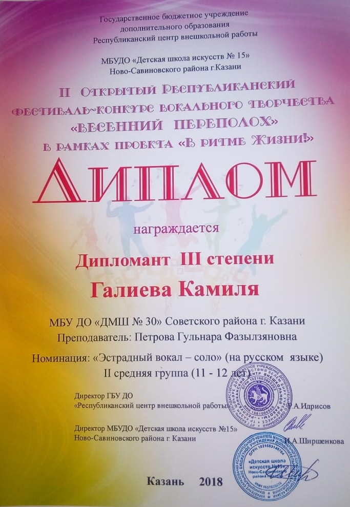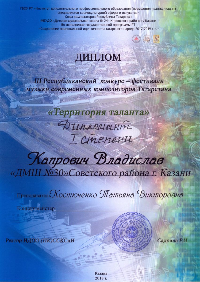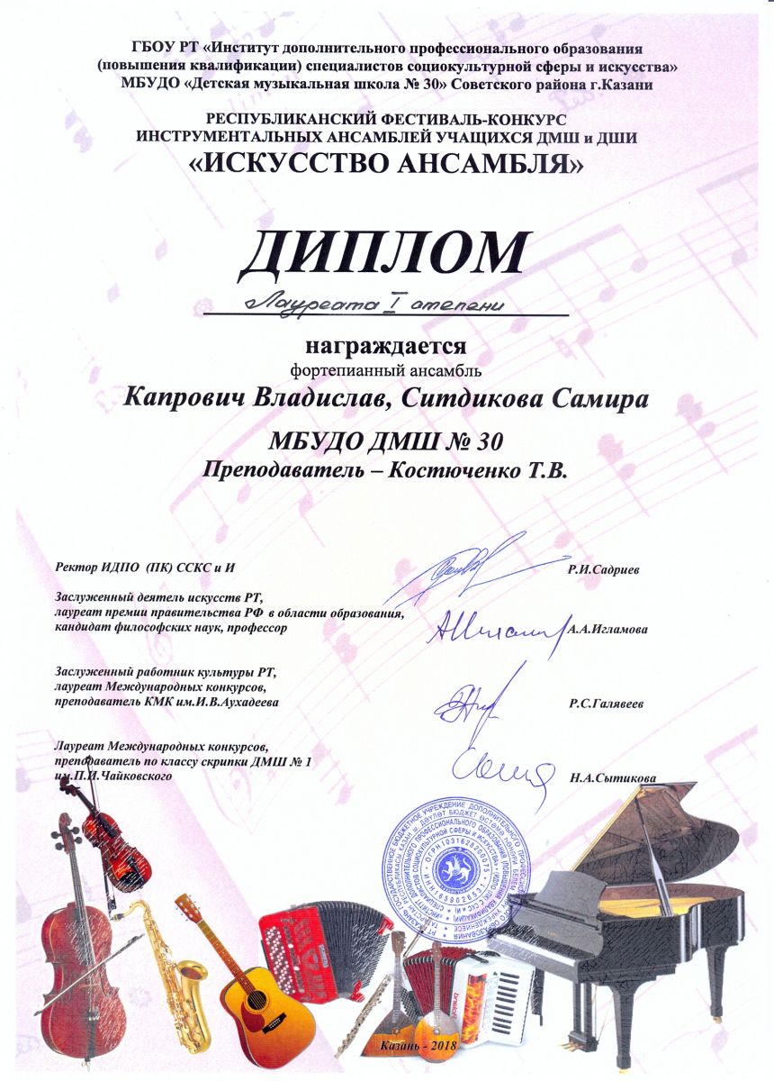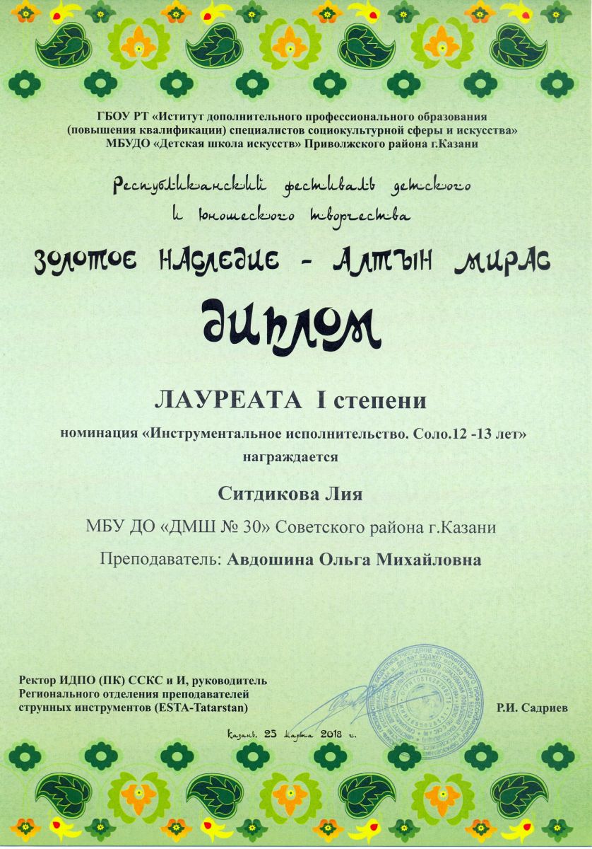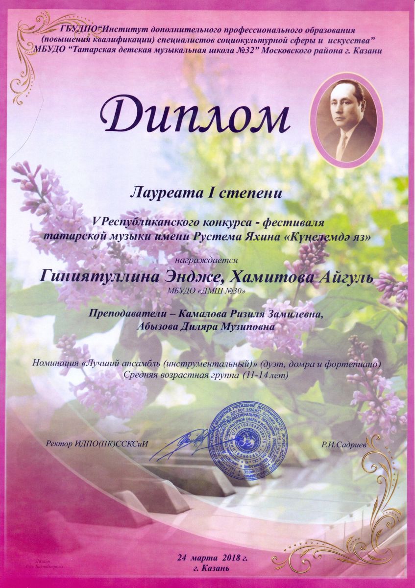 Республиканский конкурс пианистов "Музыкальная мозаика" - Ситдикова Лия - диплом I степени