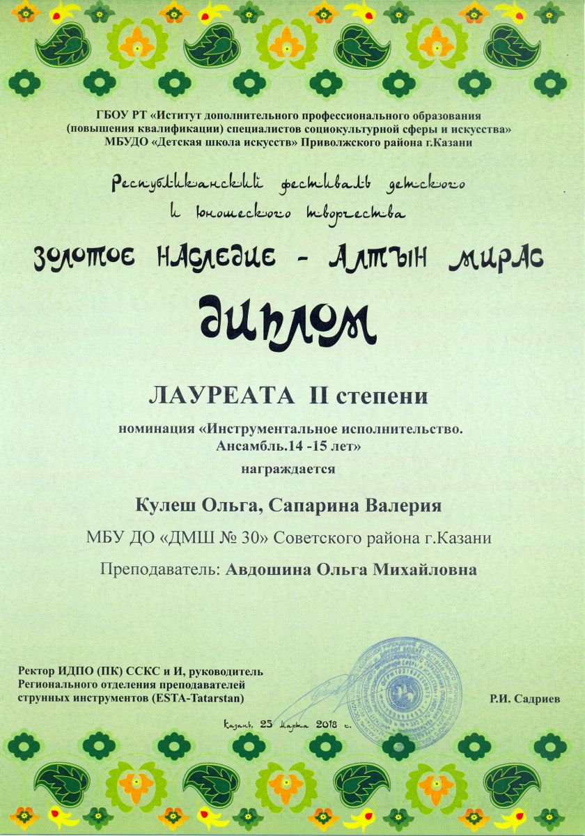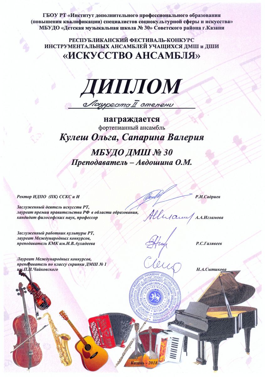 Республиканский конкурс пианистов "Музыкальная мозаика" - Сапарина Валерия - диплом III степени