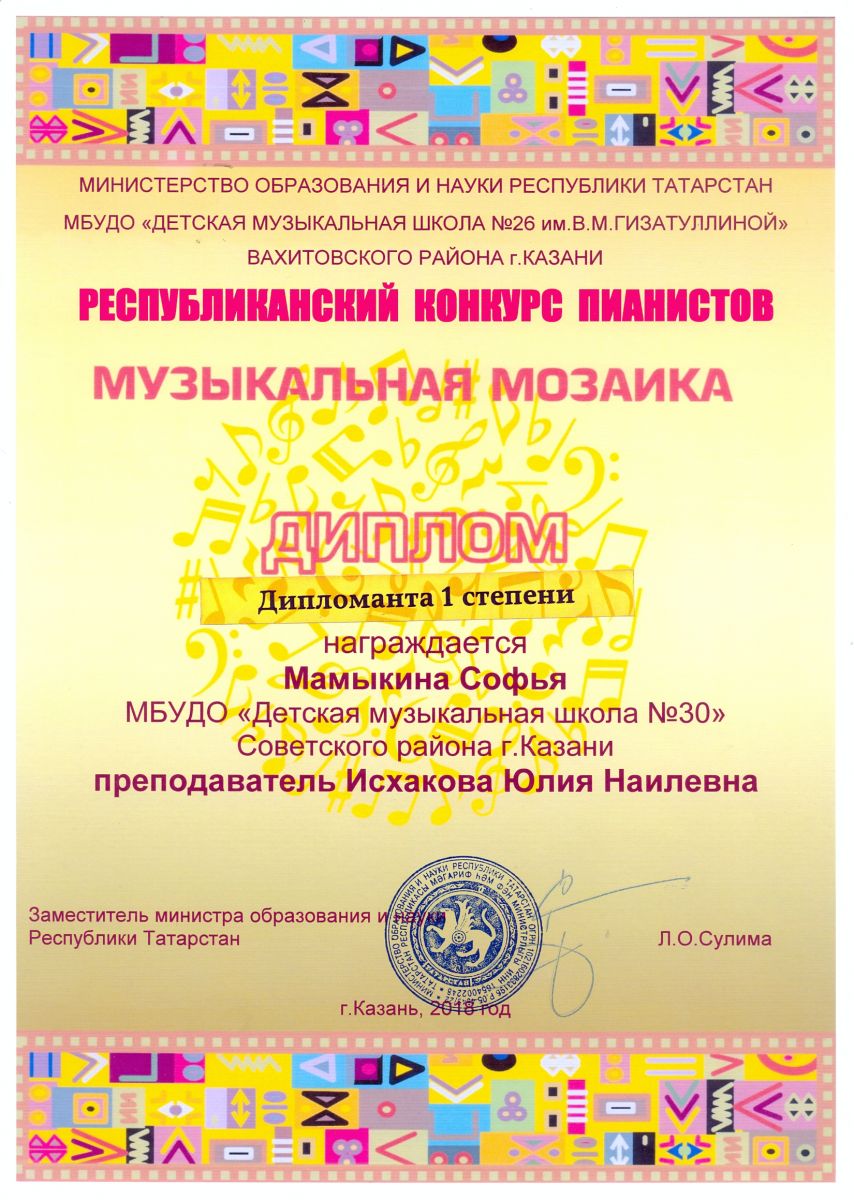 Республиканский конкурс пианистов "Музыкальная мозаика" - Мамыкина София - диплом I степени
