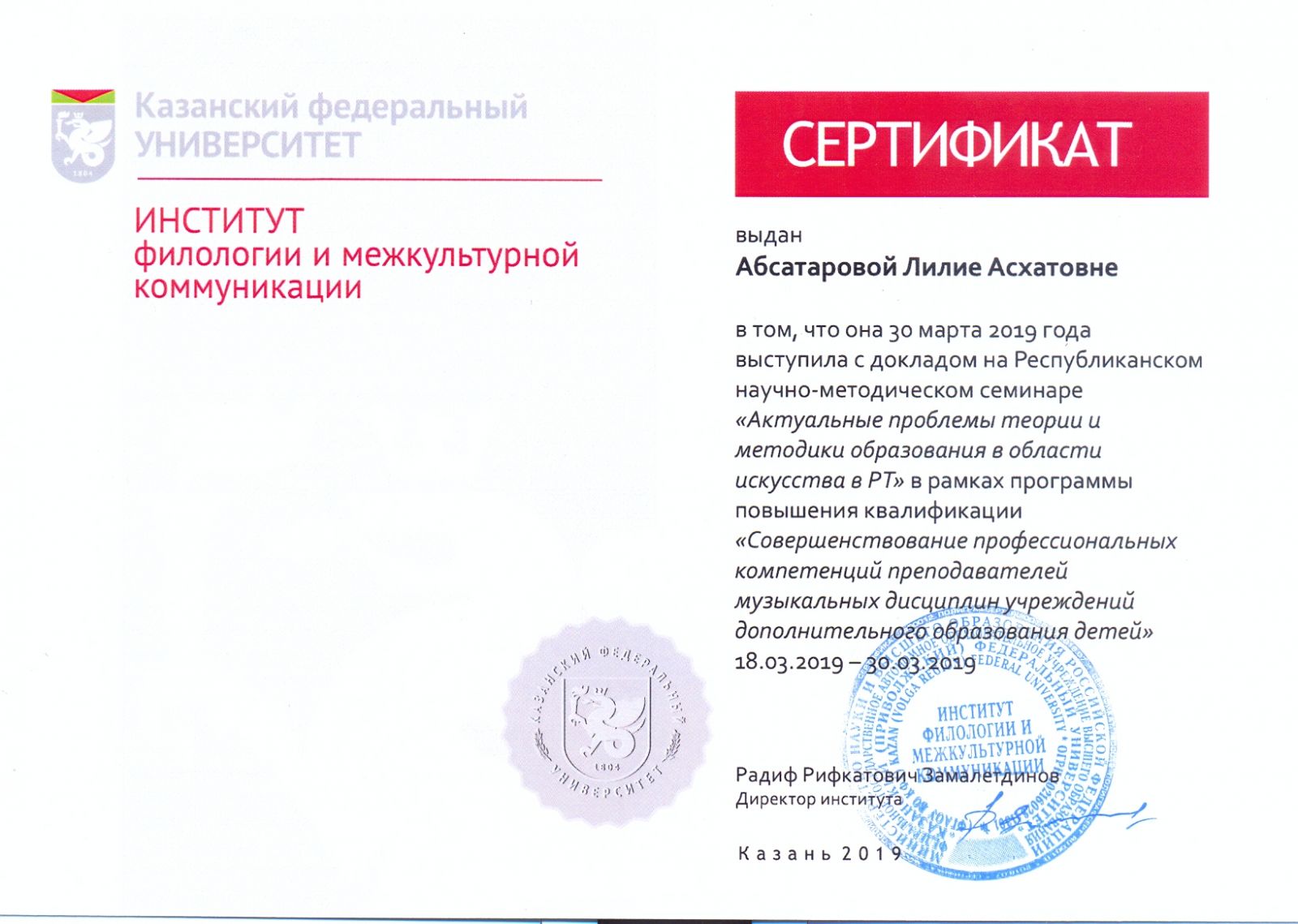 Мастер-класс заслуженного работника культуры РТ Березовой Г.П. "Постановка исполнительского аппарата на начальном этапе обучения в классе домры" - Абызова Д.М. - сертификат