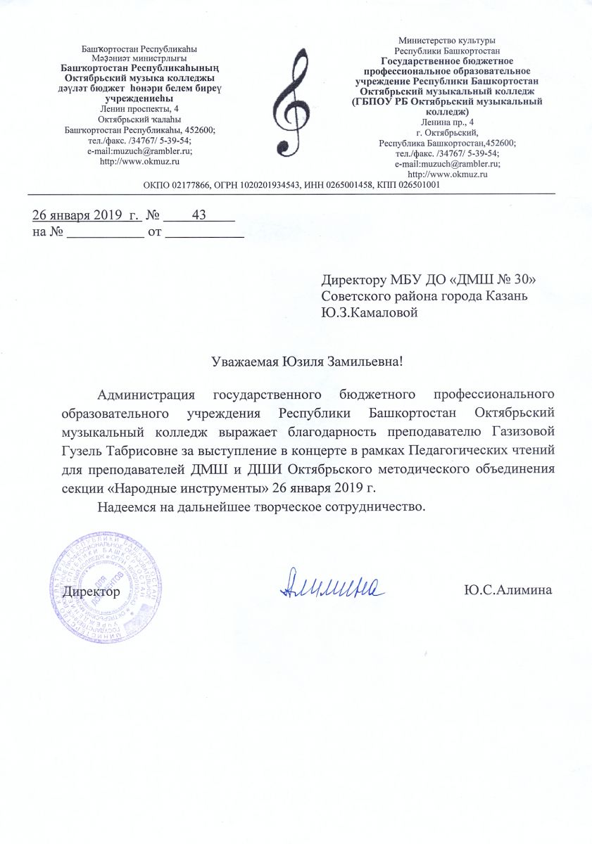Республиканские педагогические чтения (Республика Башкортостан) для преподавателей ДМШ и ДШИ секции "Народные инструменты" - Газизова Г.Т. - благодарственное письмо за концертное выступление