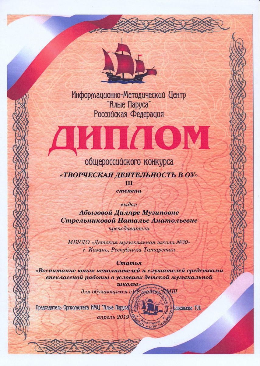 Информационно-методический Центр "Алые Паруса" Российская Федерация - статья Абызовой Д.М. и Стрельниковой Н.А. "Воспитание юных исполнителей и слушателей средствами внеклассной работы в условиях детской музыкальной школы" - диплом III степени