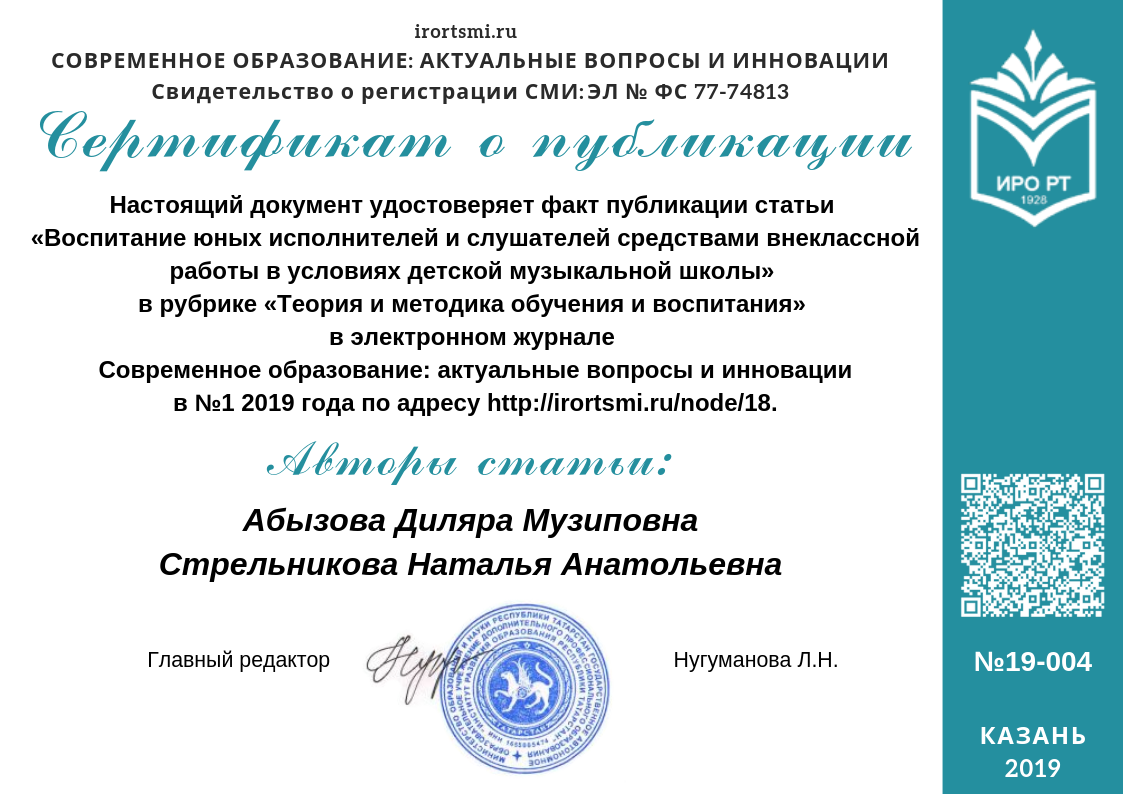 Электронный журнал "Современное образование: актуальные вопросы и инновации" - статья Абызовой Д.М. и Стрельниковой Н.А. "Воспитание юных исполнителей средствами внеклассной работы в условиях ДМШ"