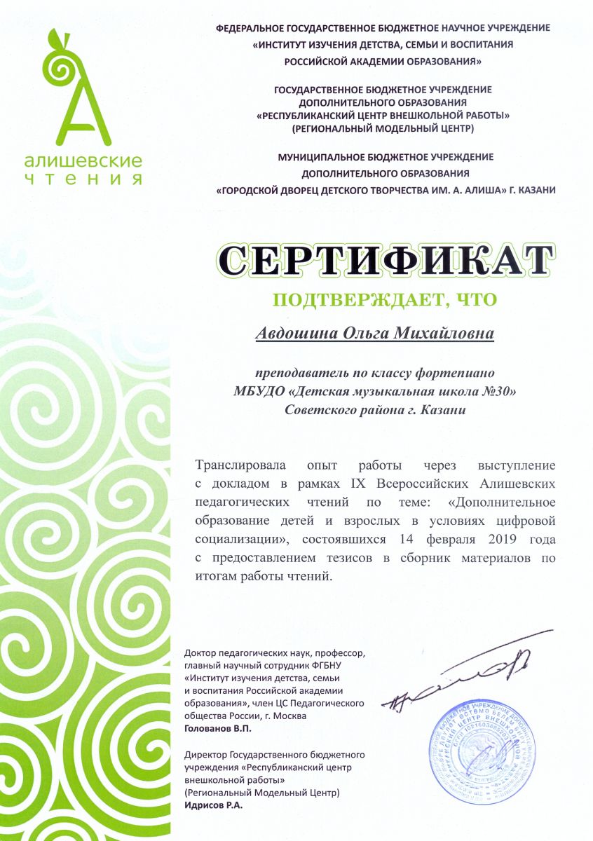 IX Всероссийские Алишевские педагогические чтения по теме: "Дополнительное образование детей и взрослых в условиях цифровой социализации" - статья Авдошиной О.М. "Внедрение и применение цифровых технологий в системе дополнительного образования (на примере работы в исполнительских классах)" в сборнике материалов по итогам работы чтений