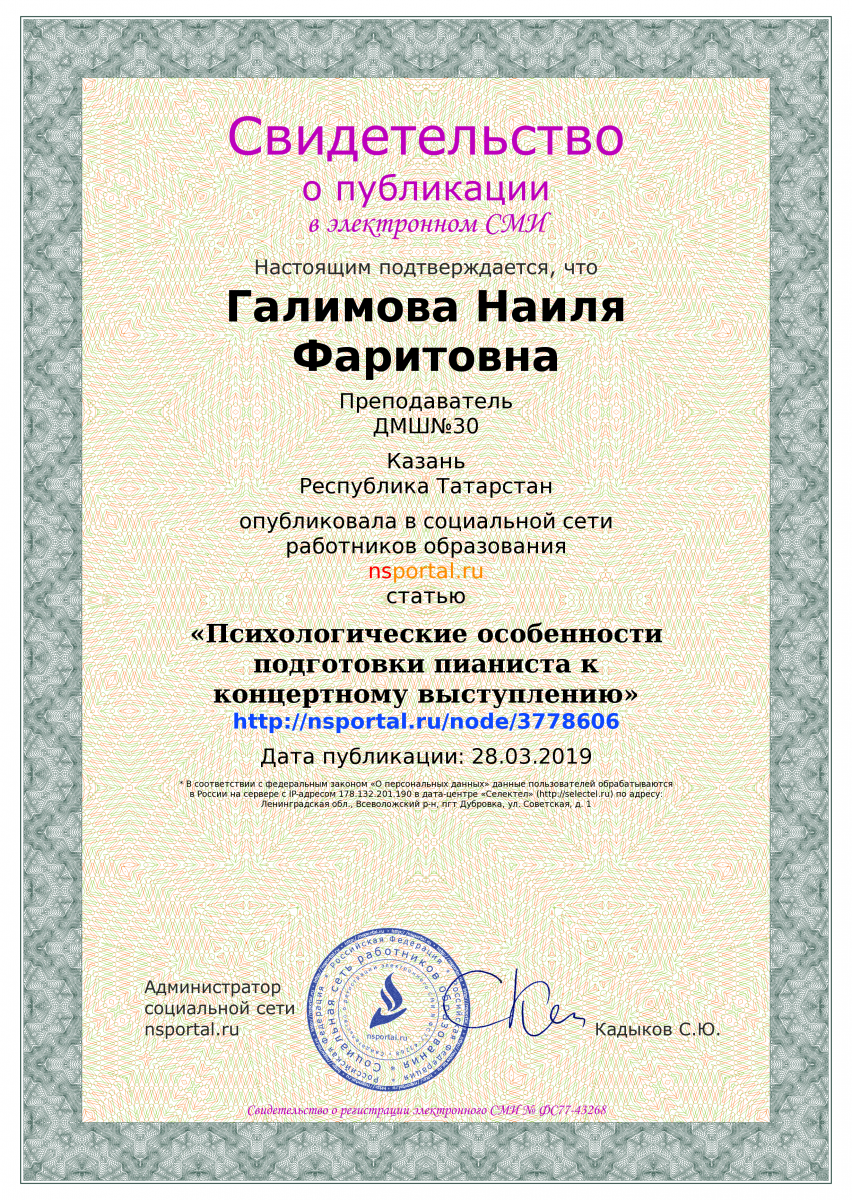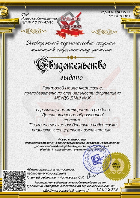 Электронное периодическое издание "Педагогический мир" (PEDMIR.RU) - статья Галимовой Н.Ф. "Практические аспекты психологической поддержки юного пианиста в рамках публичного выступления"