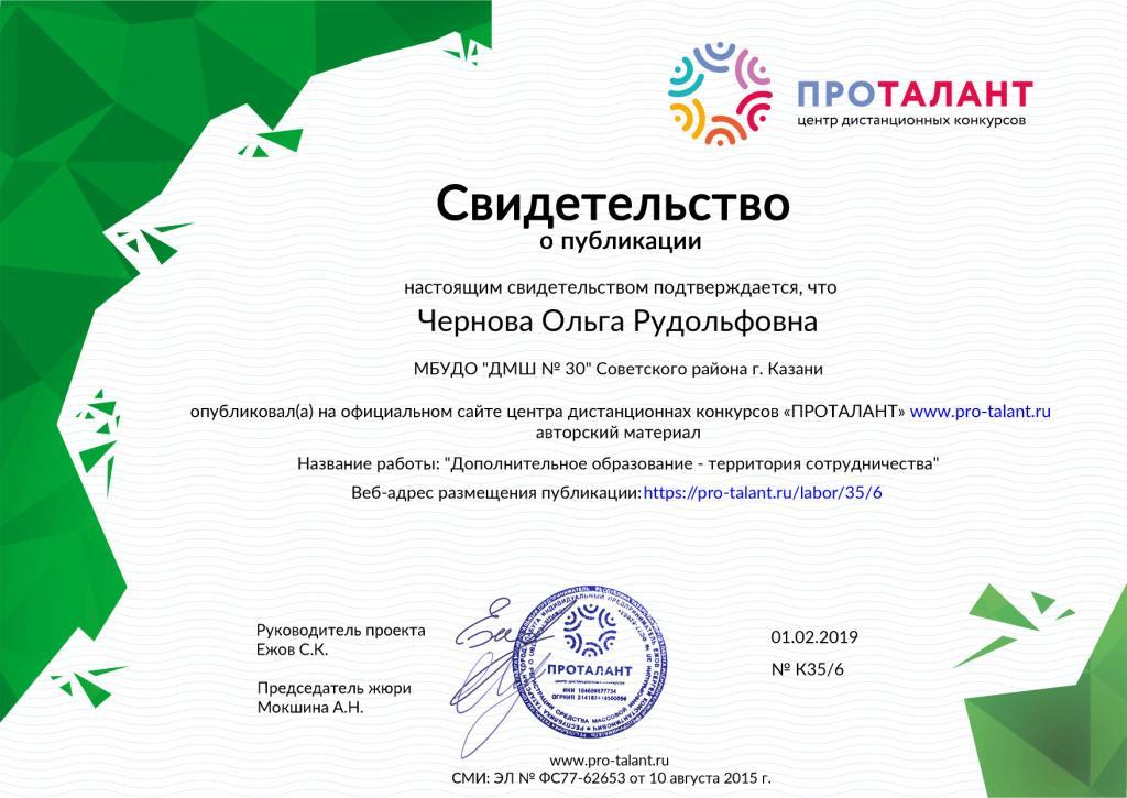 Международный сайт центра дистанционных конкурсов "Проталант" - статья Черновой О.Р. "Дополнительное образование - территория творчества"