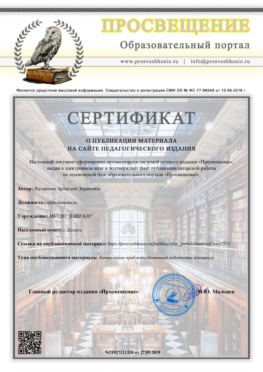 Сайт педагогического издания "Просвещение" - статья Хусаиновой З.З. "Актуальные проблемы домашней подготовки учащихся"
