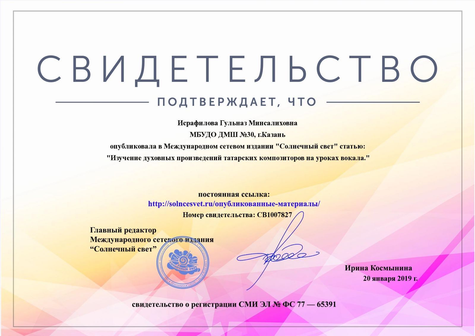 Международное сетевое издание "Солнечный свет" - статья Исрафиловой Г.М. "Изучение духовных произведений татарских композиторов на уроках вокала"