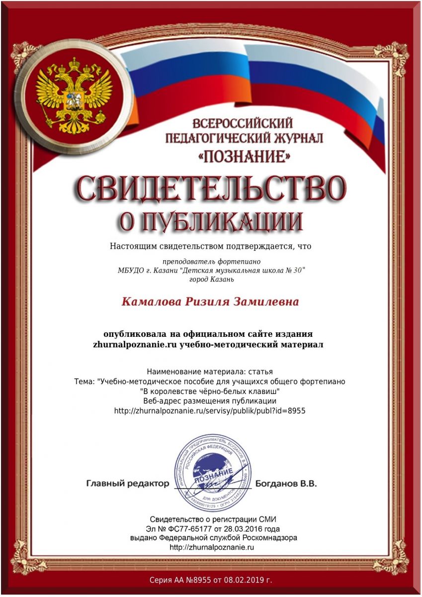 Всероссийский педагогический журнал "Познание" - статья Камаловой Р.З. "Учебно-методическое пособие для учащихся общего фортепиано "В королевстве  чёрно-белых клавиш"