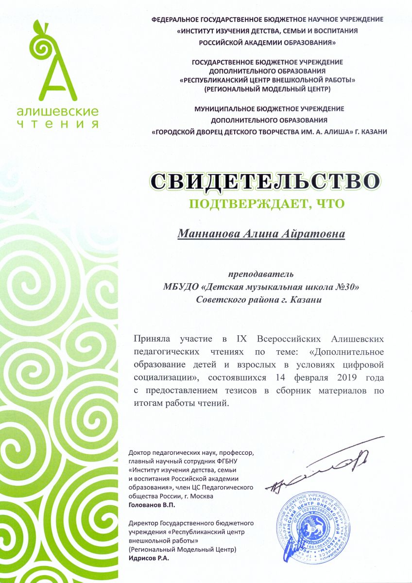 IX Всероссийские Алишевские педагогические чтения по теме: "Дополнительное образование детей и взрослых в условиях цифровой социализации" - статья Маннановой А.А. "Развитие навыка работы с цифровыми ресурсами в классе флейты" в сборнике материалов по итогам работы чтений