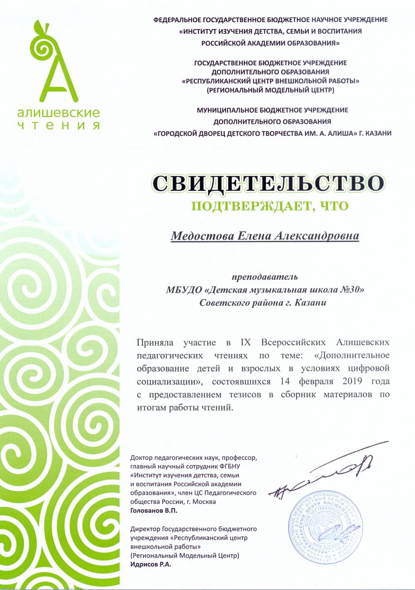 IX Всероссийские Алишевские педагогические чтения по теме: "Дополнительное образование детей и взрослых в условиях цифровой социализации" - статья Медостовой Е.А. "Применение цифровых технологий на уроках фортепиано" в сборнике материалов по итогам работы чтений