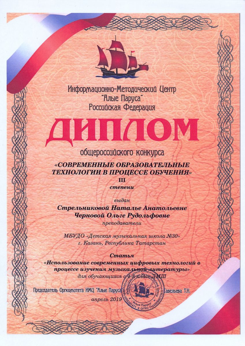 Информационно-методический Центр "Алые Паруса" Российская Федерация - статья Стрельниковой Н.А. и Черновой О.Р.  "Использование современных цифровых технологий в процессе изучения музыкальной литературы" - диплом III степени