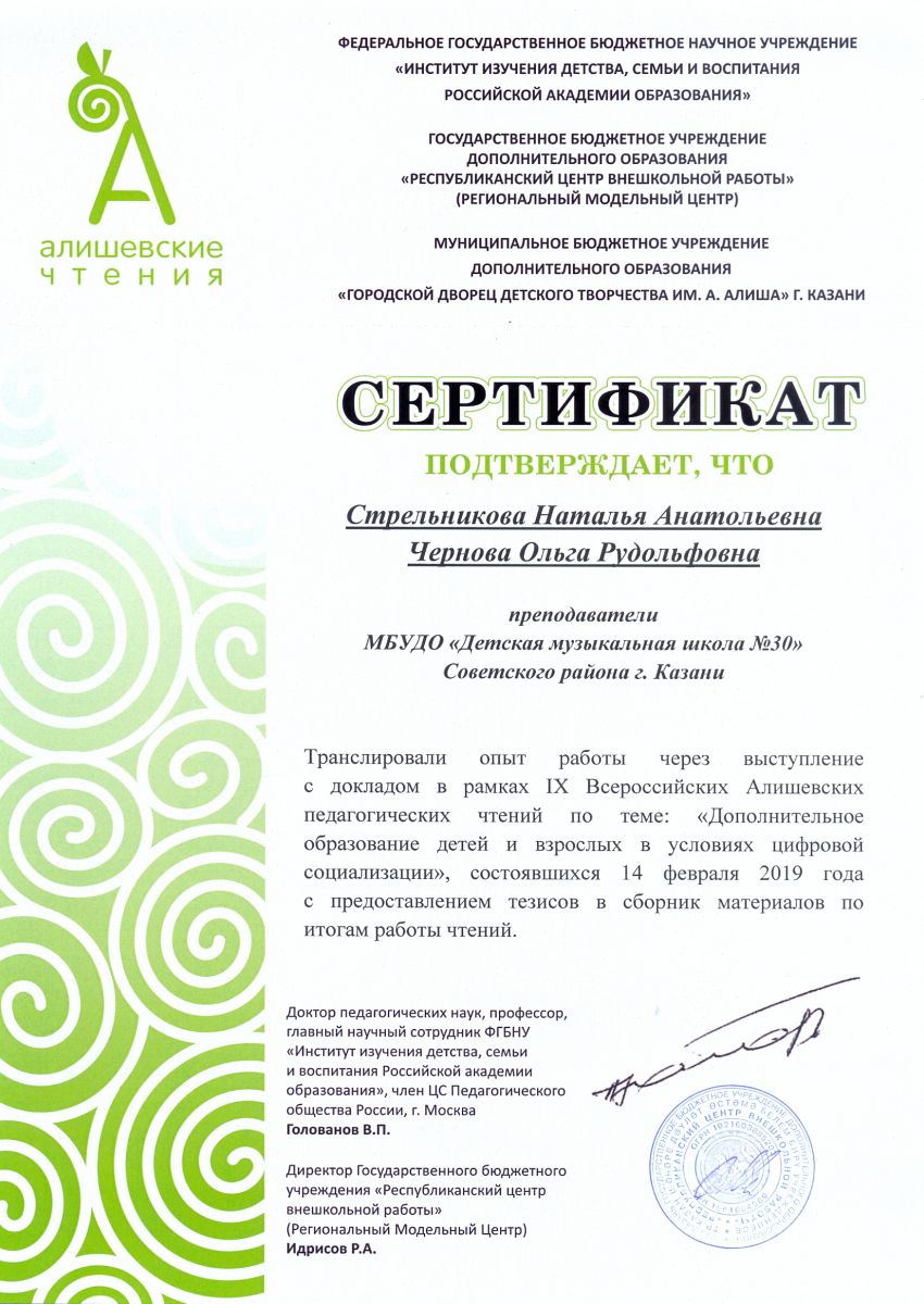 IX Всероссийские Алишевские педагогические чтения по теме: "Дополнительное образование детей и взрослых в условиях цифровой социализации" - статья Стрельниковой Н.А. и Черновой О.Р. "Цифровая образовательная среда на уроках музыкальной литературы" в сборнике материалов по итогам работы чтений