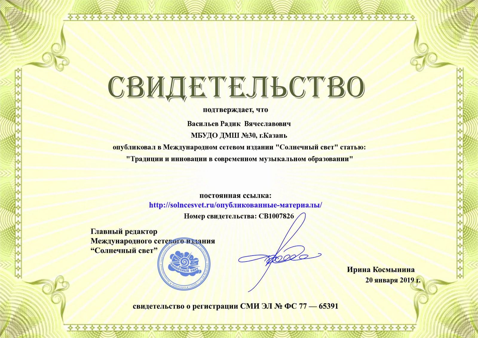 Международное сетевое издание "Солнечный свет" - статья Васильева Р.В. "Традиции и инновации в современном музыкальном образовании"