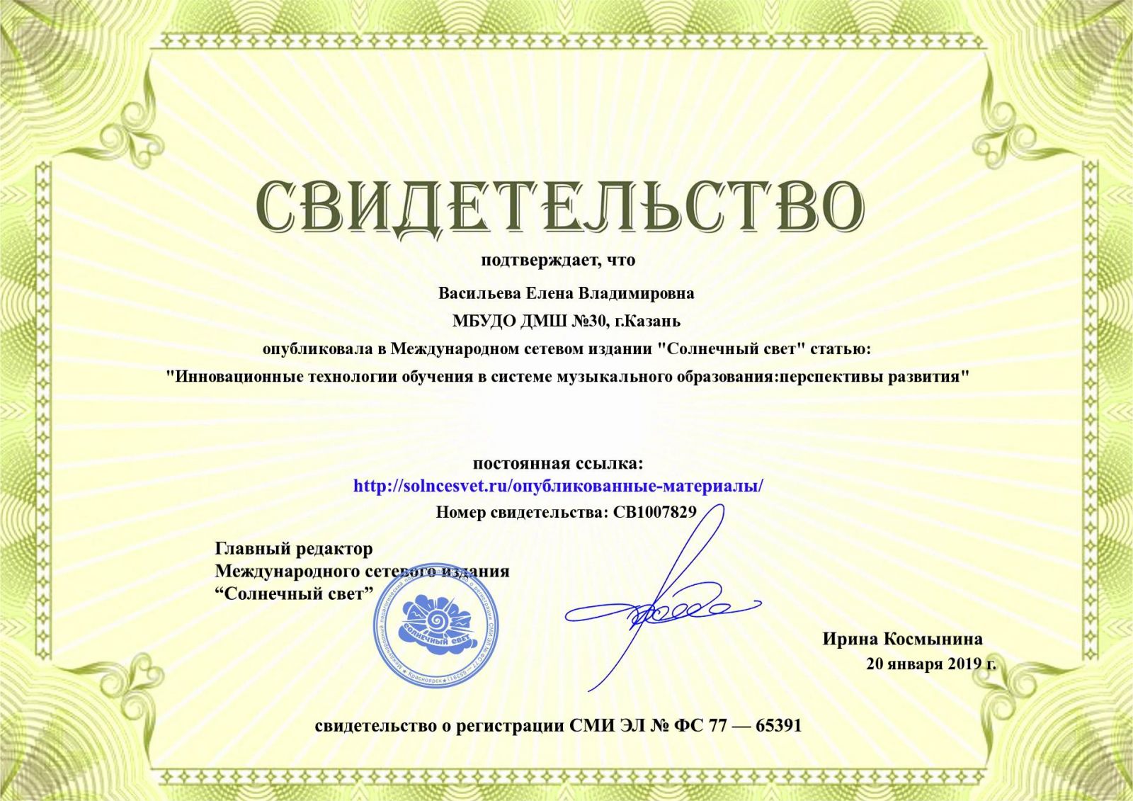 Международное сетевое издание "Солнечный свет" - статья Васильевой Е.В. "Инновационные технологии обучения в системе музыкального образования: перспективы развития"