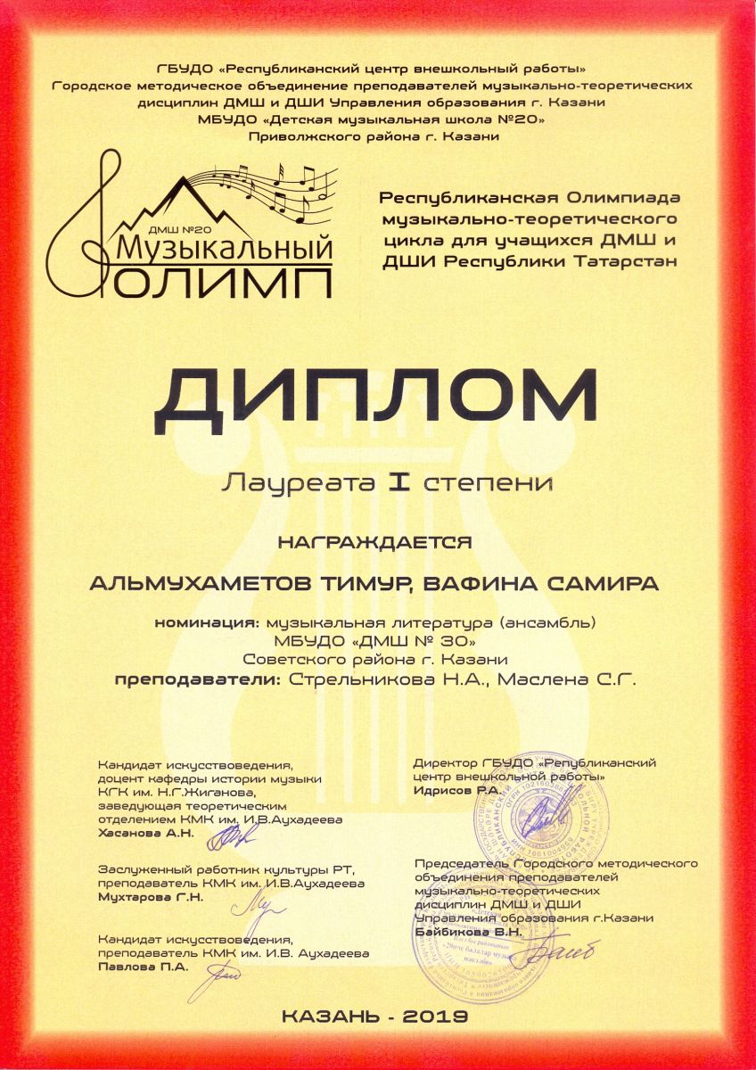 Республиканская Олимпиада музыкально-теоретического цикла для учащихся ДМШ и ДШИ РТ "Музыкальный Олимп" - Мубаракшина Гузель - участник