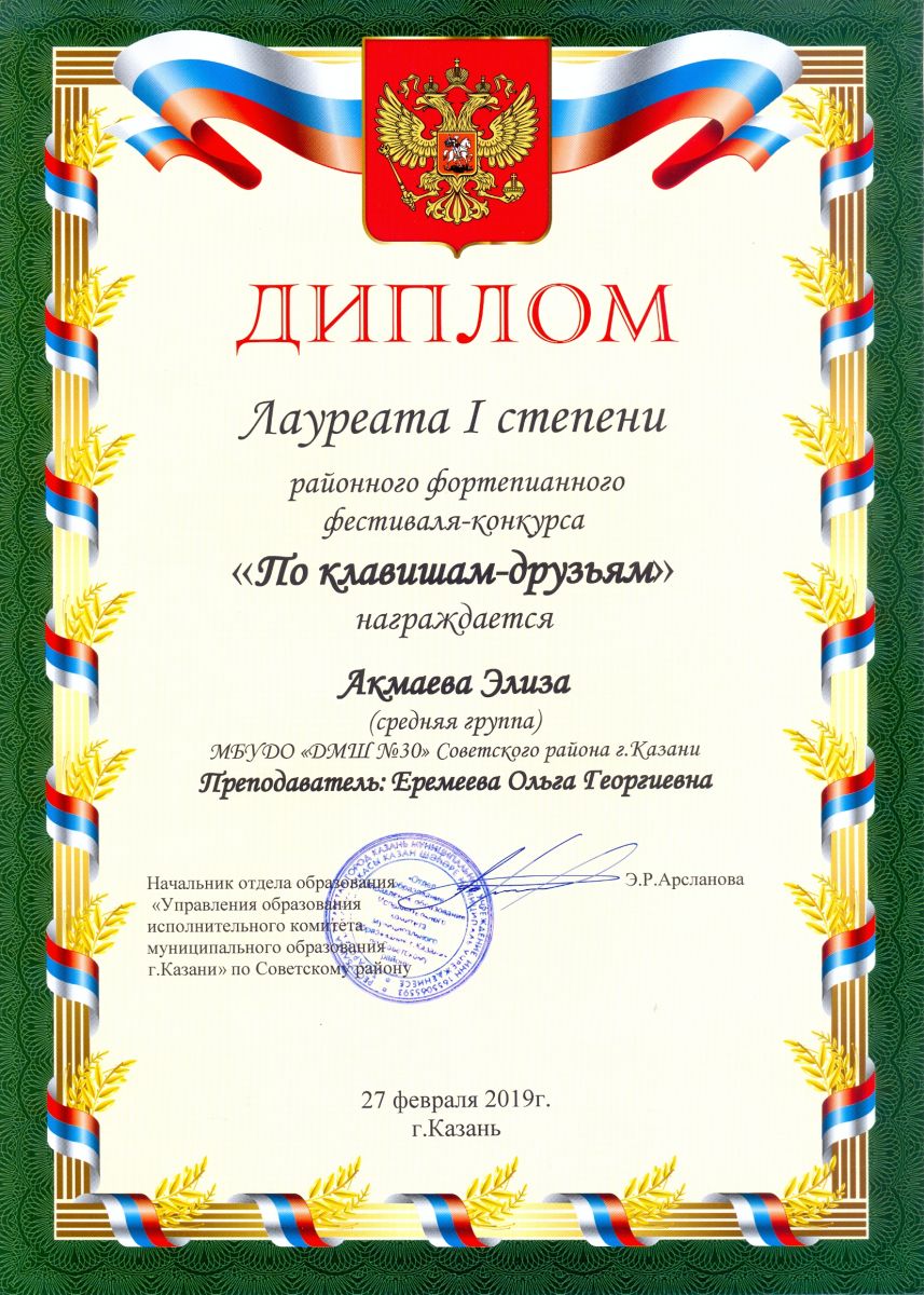 Районный фортеианный фестиваль-конкрус "По клавишам-друзьям" - Акмаева Элиза - I место