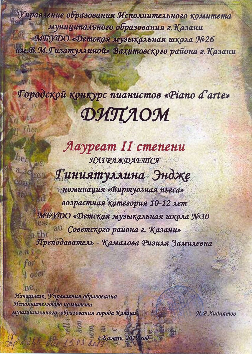 Городской конкурс пианистов "Piano d'arte" - Гиниятуллина Эндже - II место
