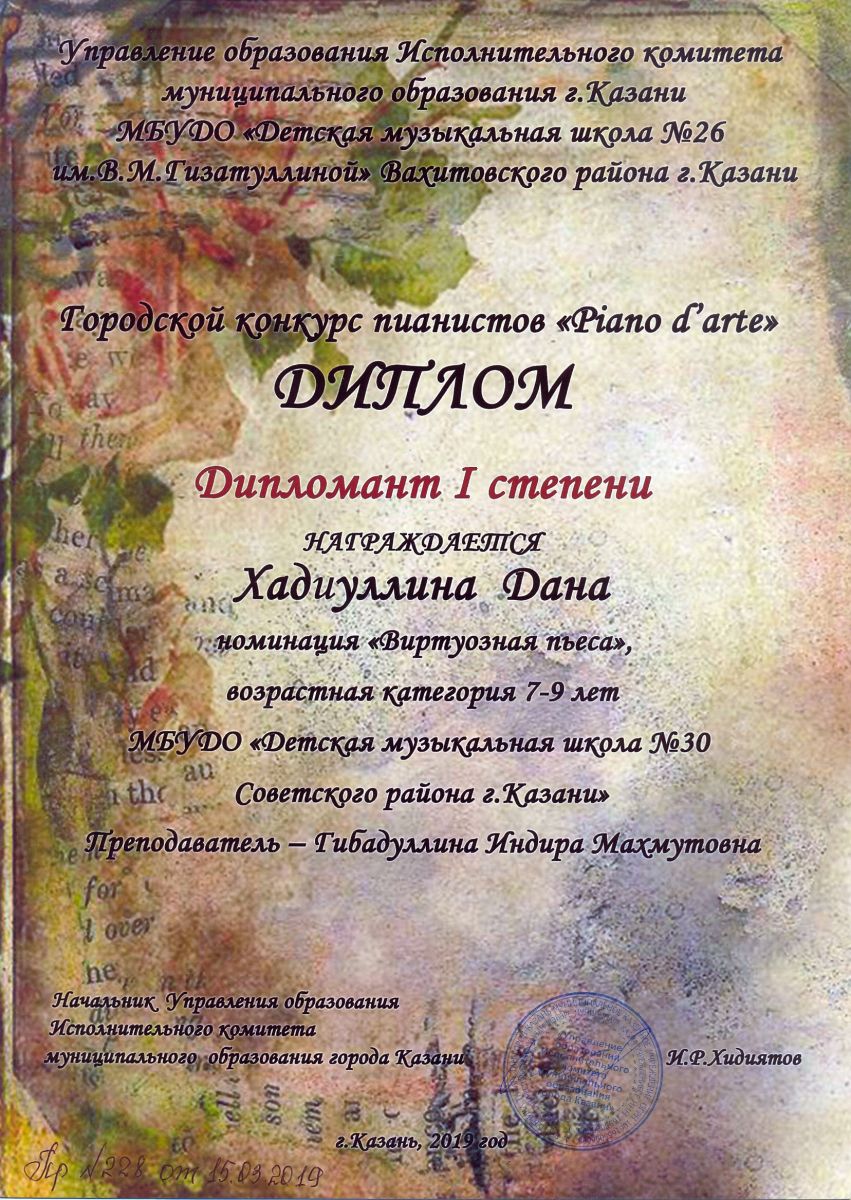 Городской конкурс пианистов "Piano d'arte" - Хадиуллина Дана - диплом I степени