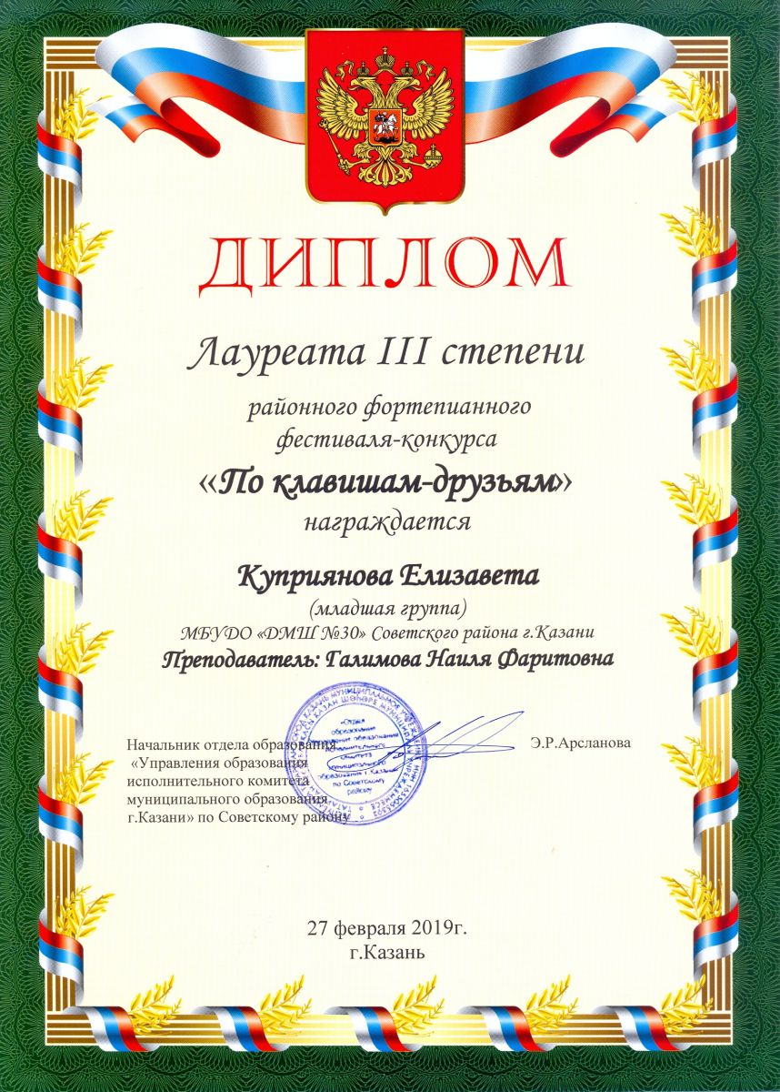 Районный фортеианный фестиваль-конкрус "По клавишам-друзьям" - Куприянова Елизавета - III место