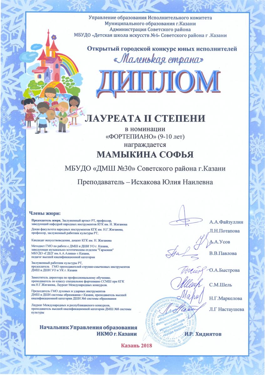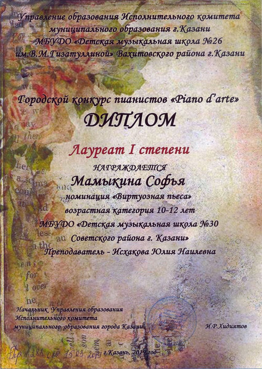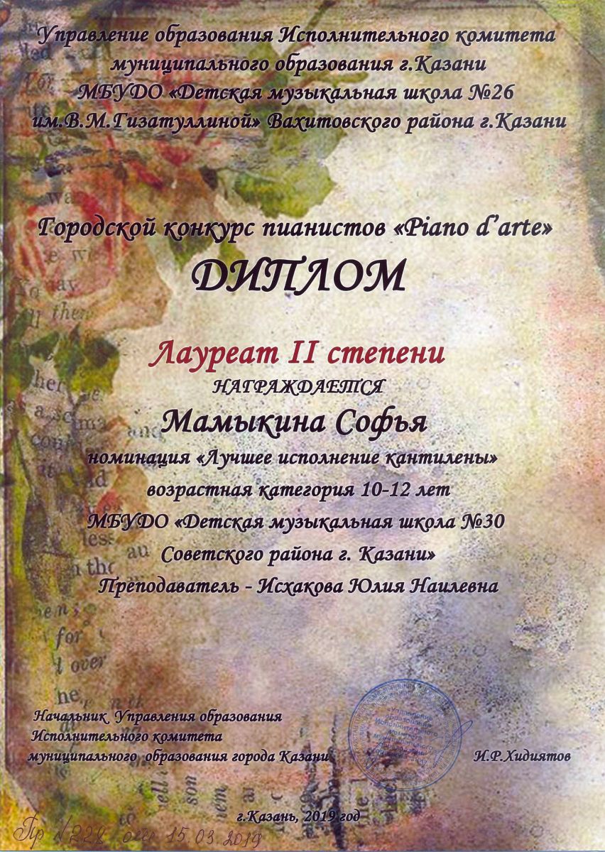 Городской конкурс пианистов "Piano d'arte" - Мамыкина Софья - II место