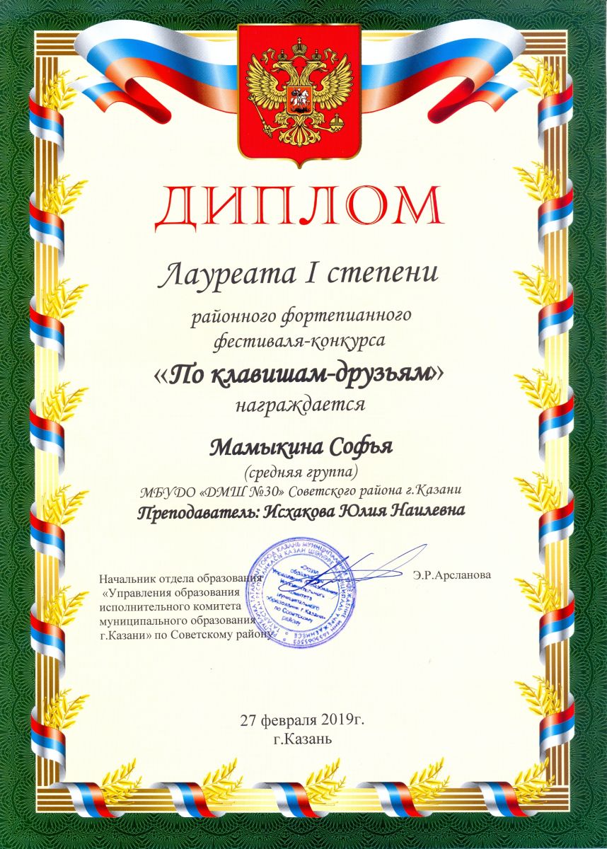 Районный фортеианный фестиваль-конкрус "По клавишам-друзьям" - Мамыкина Софья - I место