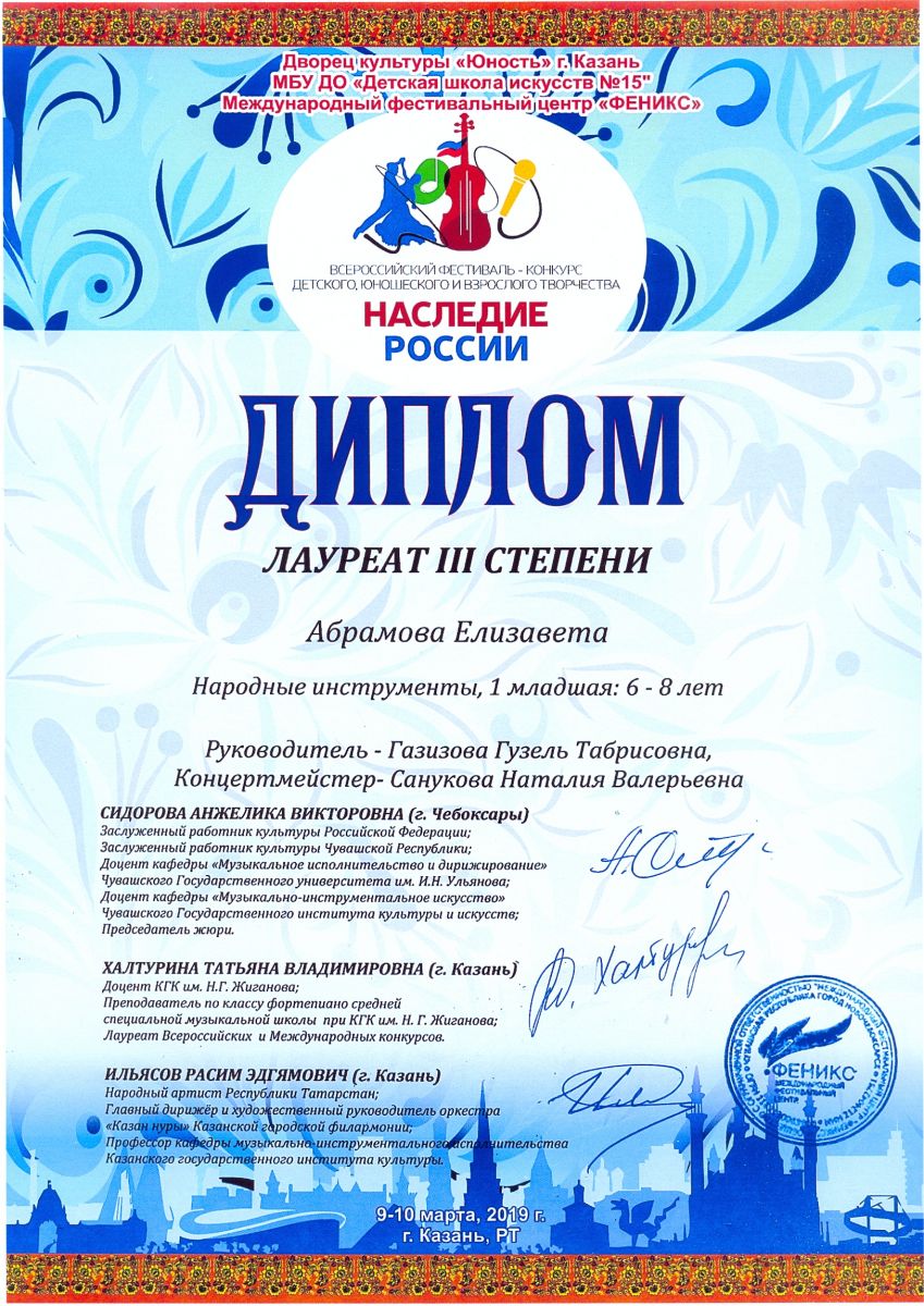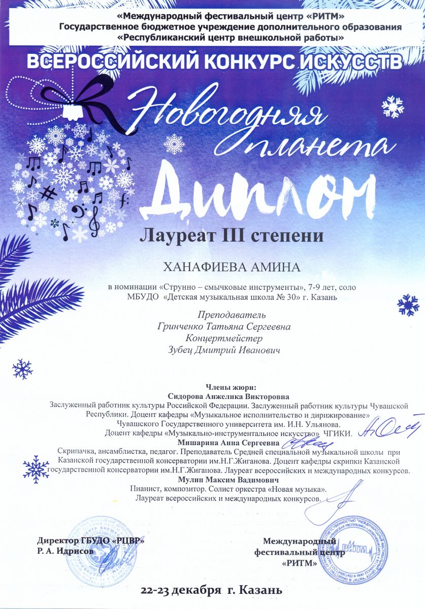 Всероссийский конкурс искусств "Новогодняя планета" - Ханафиева Амина - III место