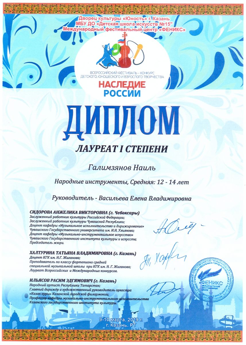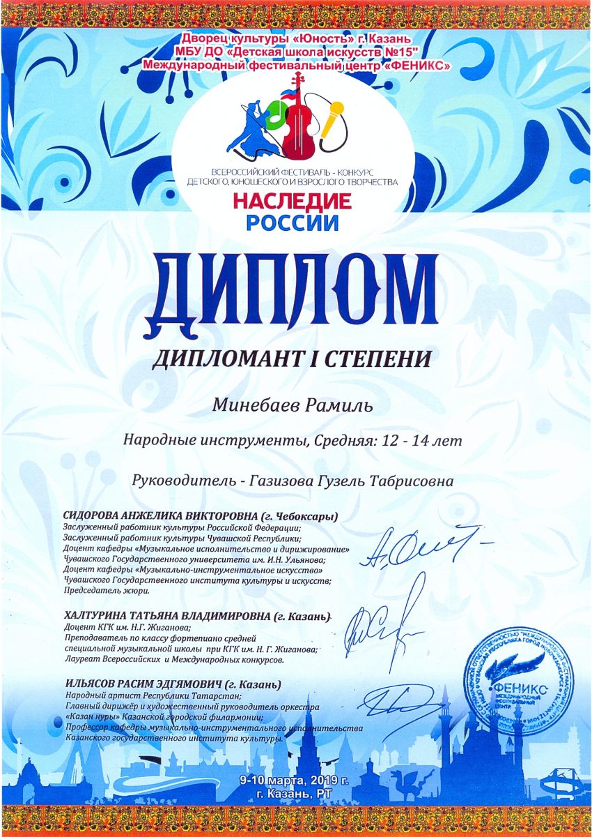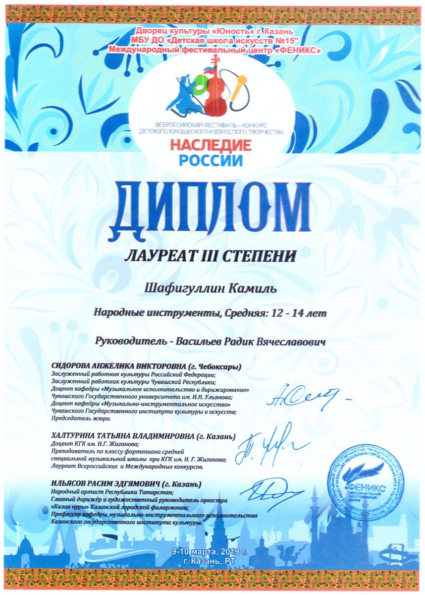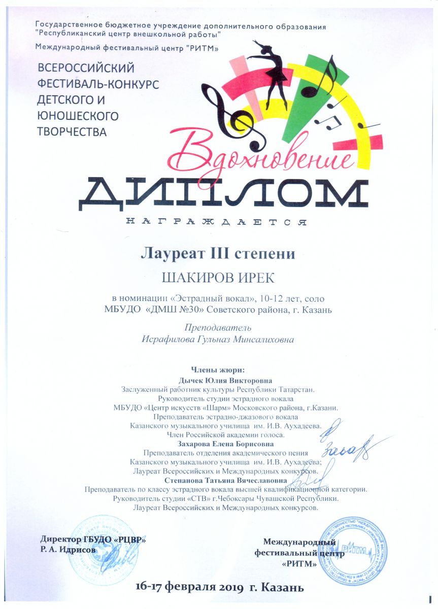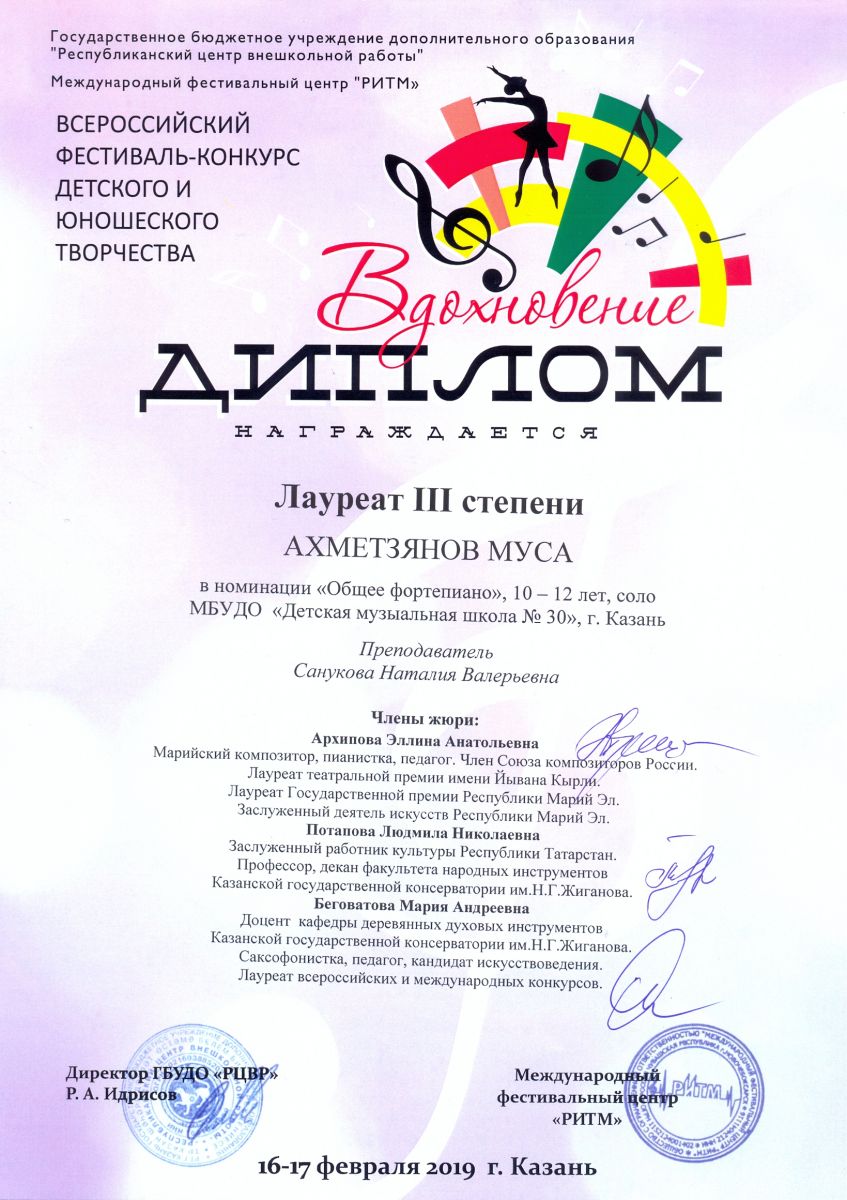 Всероссийский фестиваль-конкурс "Вдохновение" - Ахметзянов Муса - III место