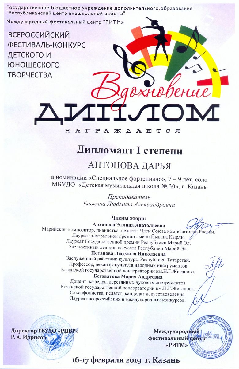 Всероссийский фестиваль-конкурс "Вдохновение" - Антонова Дарья - диплом I степени