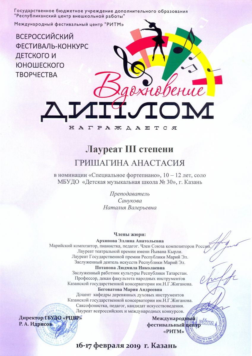 Всероссийский фестиваль-конкурс "Вдохновение" - Гришагина Анастасия - III месмто