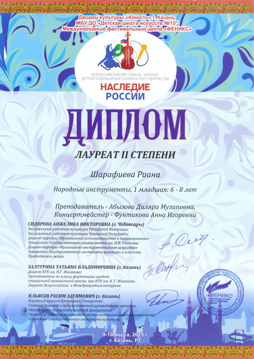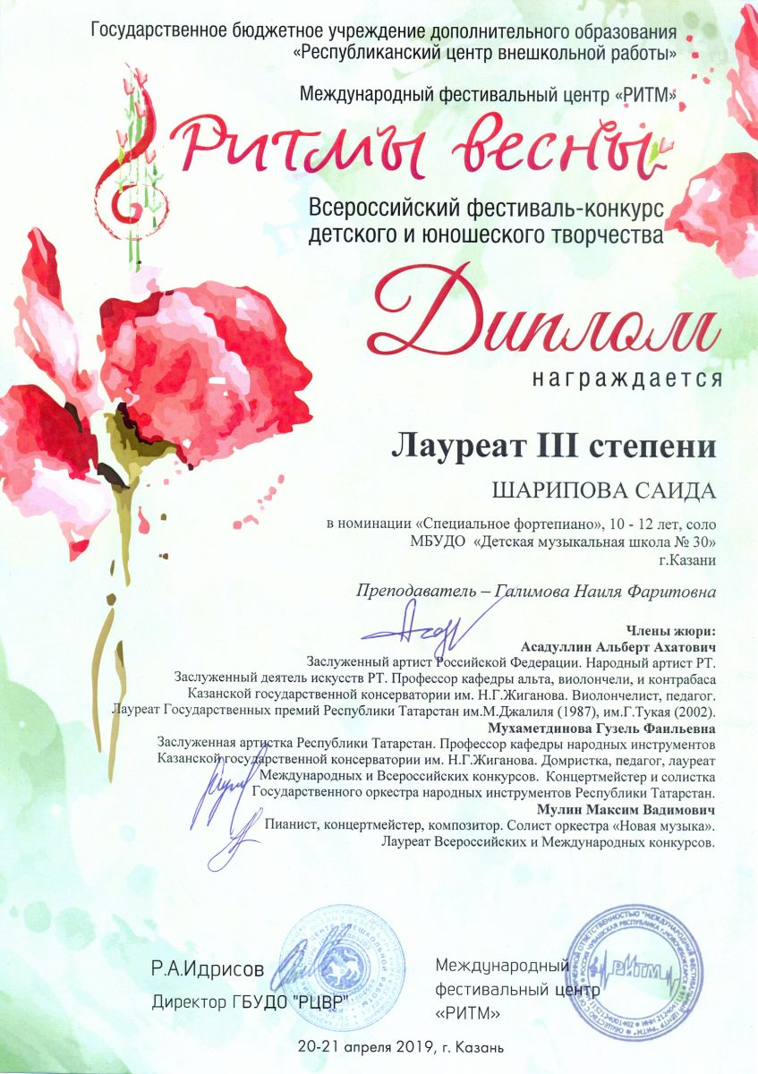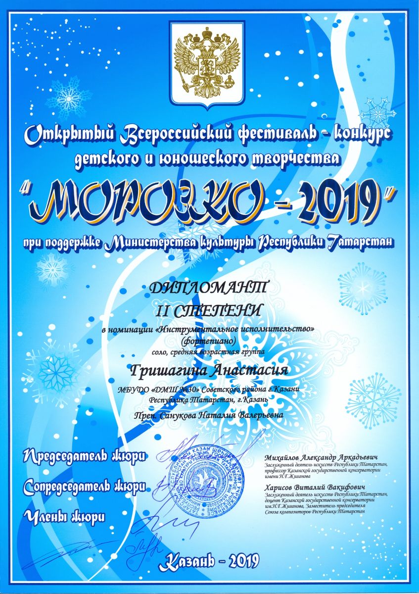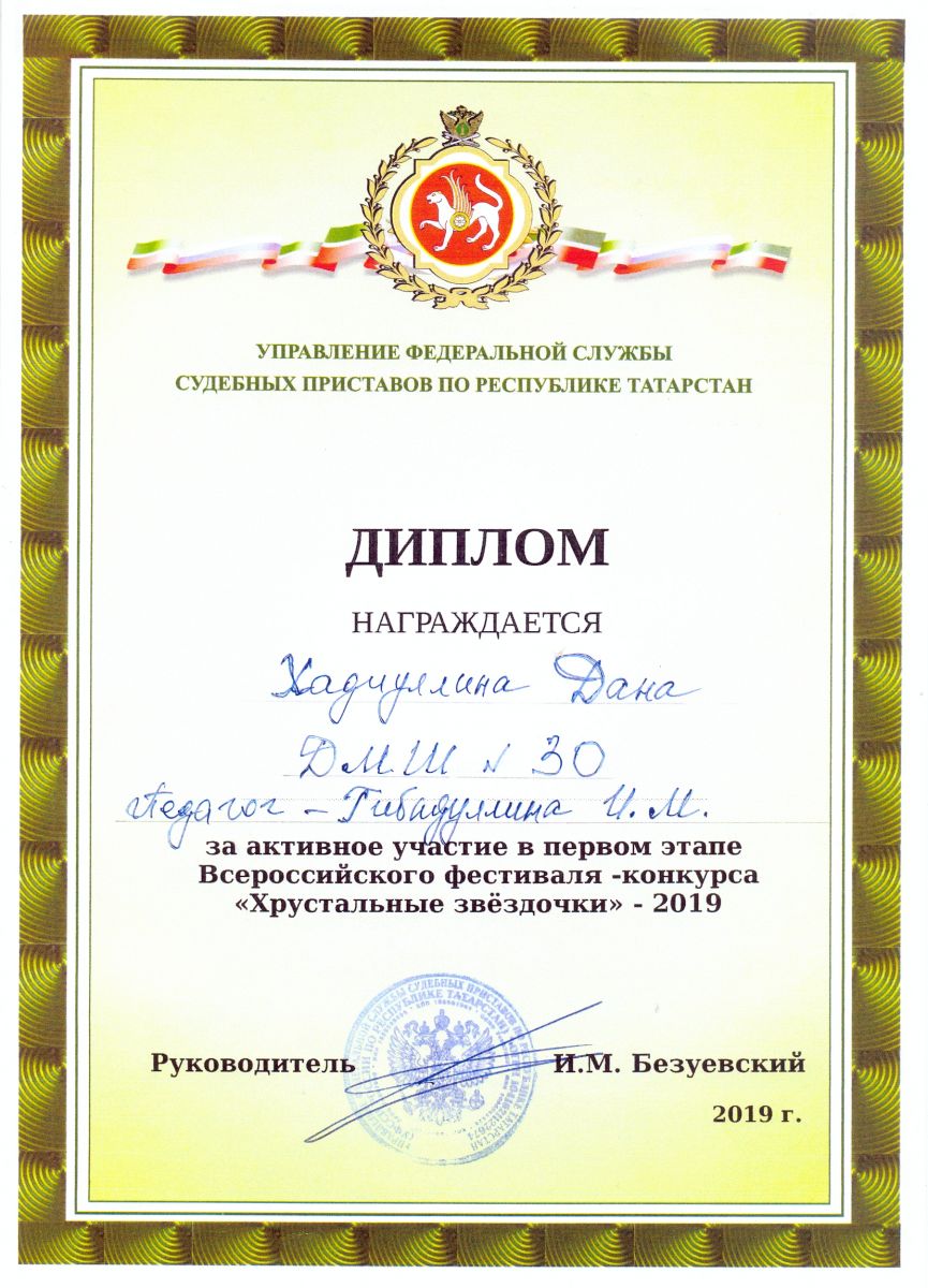 Всероссийский фестиваль-конкурс "Хрустальные звездочки-2019" - Хадиуллина Дана - диплом