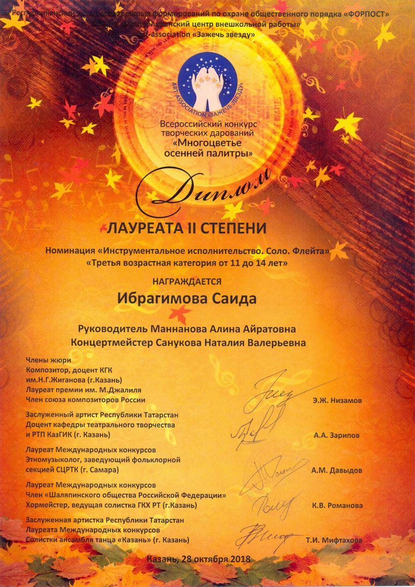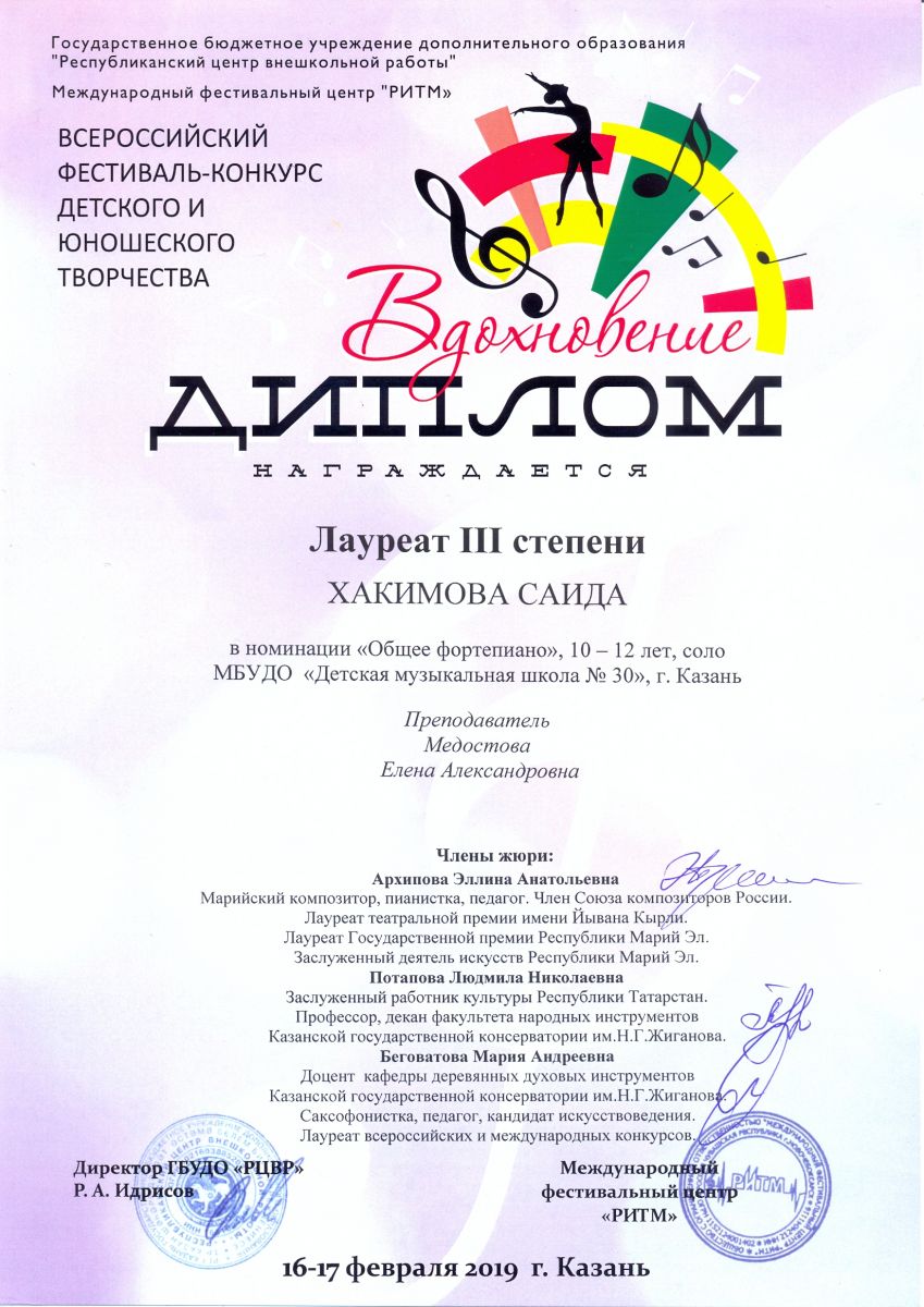 Всероссийский фестиваль-конкурс "Вдохновение" - Хакимова Саида - III место