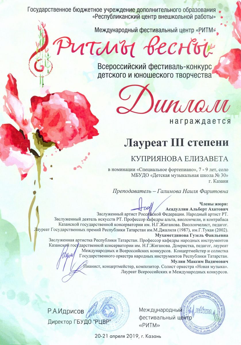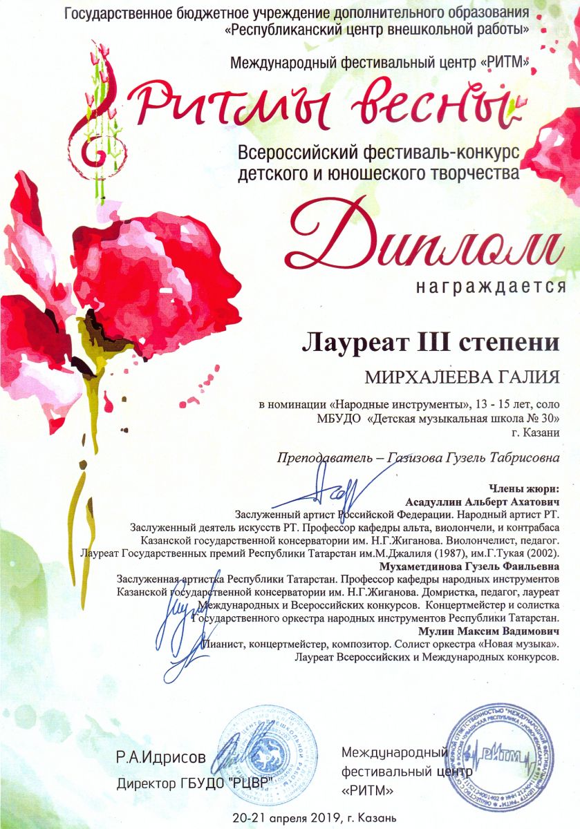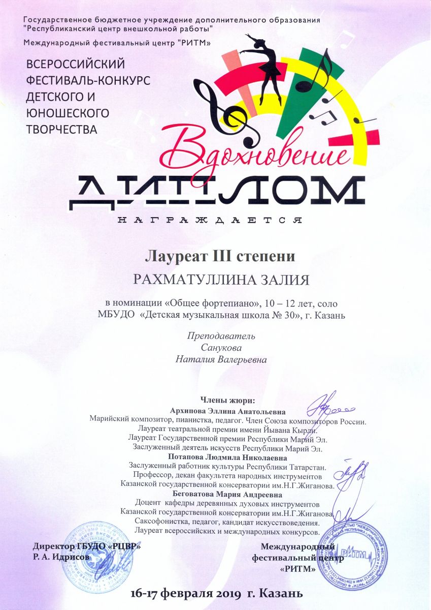 Всероссийский фестиваль-конкурс "Вдохновение" - Рахматуллина Залия - III место