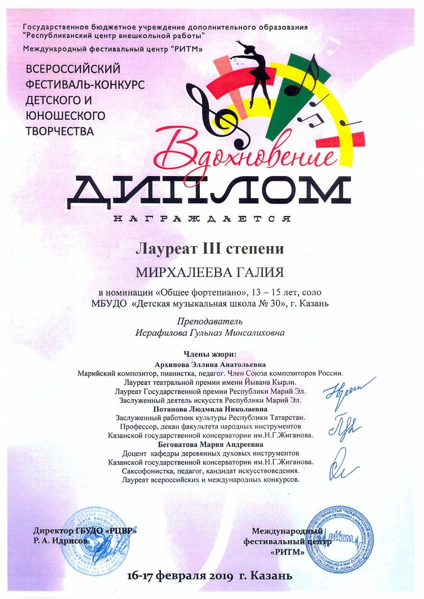 Всероссийский фестиваль-конкурс "Вдохновение" - Мирхалеева Галия - III место