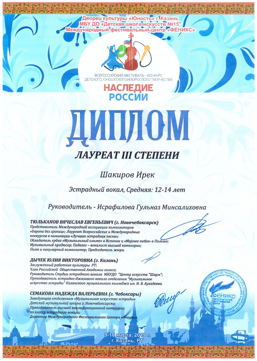 Всероссийский фестиваль-конкурс "Вдохновение" - Шакиров Ирек - III место