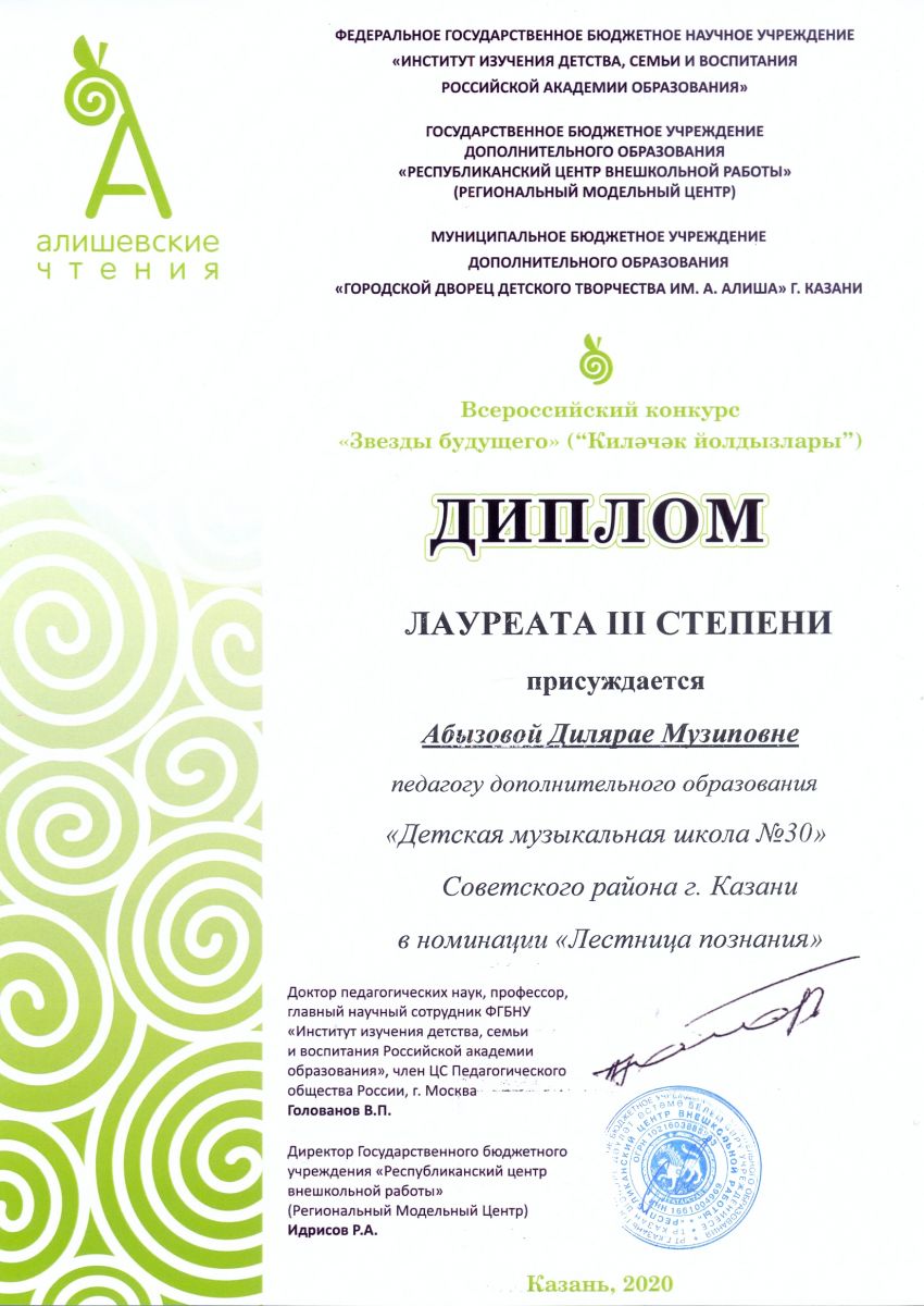Всероссийский конкурс "Звезды будущего" ("Киләчәк йәлдызлары") в рамках Алишевских чтений - Абызова Д.М. - III место в номинации "Лестница познания"