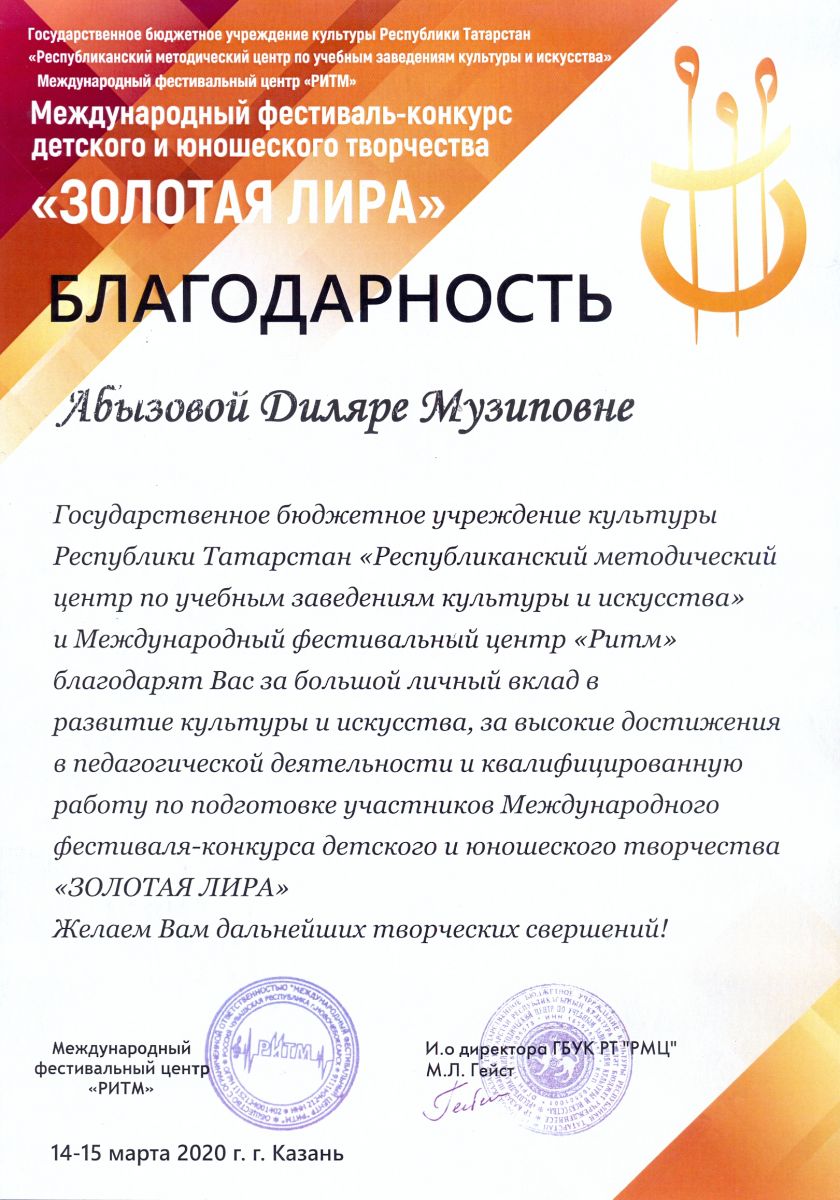 Международный фестиваль-конкурс детского и юношеского творчества "ЗОЛОТАЯ ЛИРА" - Абызова Д.М. - Благодарственное письмо