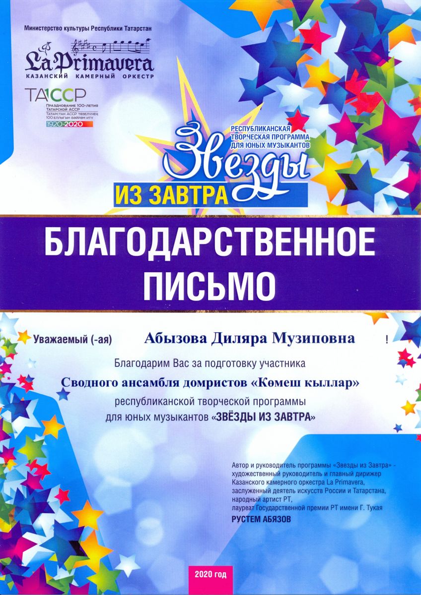 Республиканская творческая программа для юных музыкантов "Звезды из завтра" - Абызова Д.М. - Благодарственное письмо