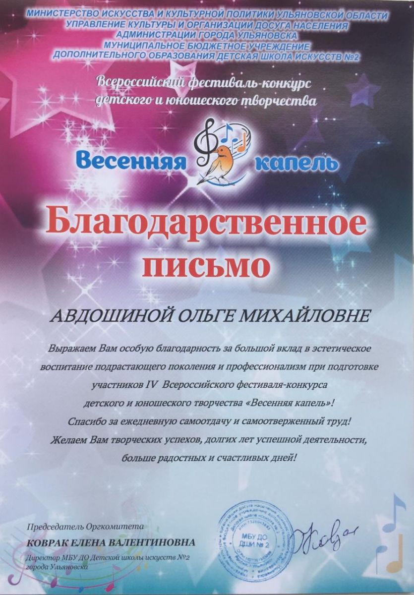 Всероссийский фестиваль-конкурс детского и юношеского творчества "Весенняя капель" - Авдошина О.М. - Благодарственное письмо
