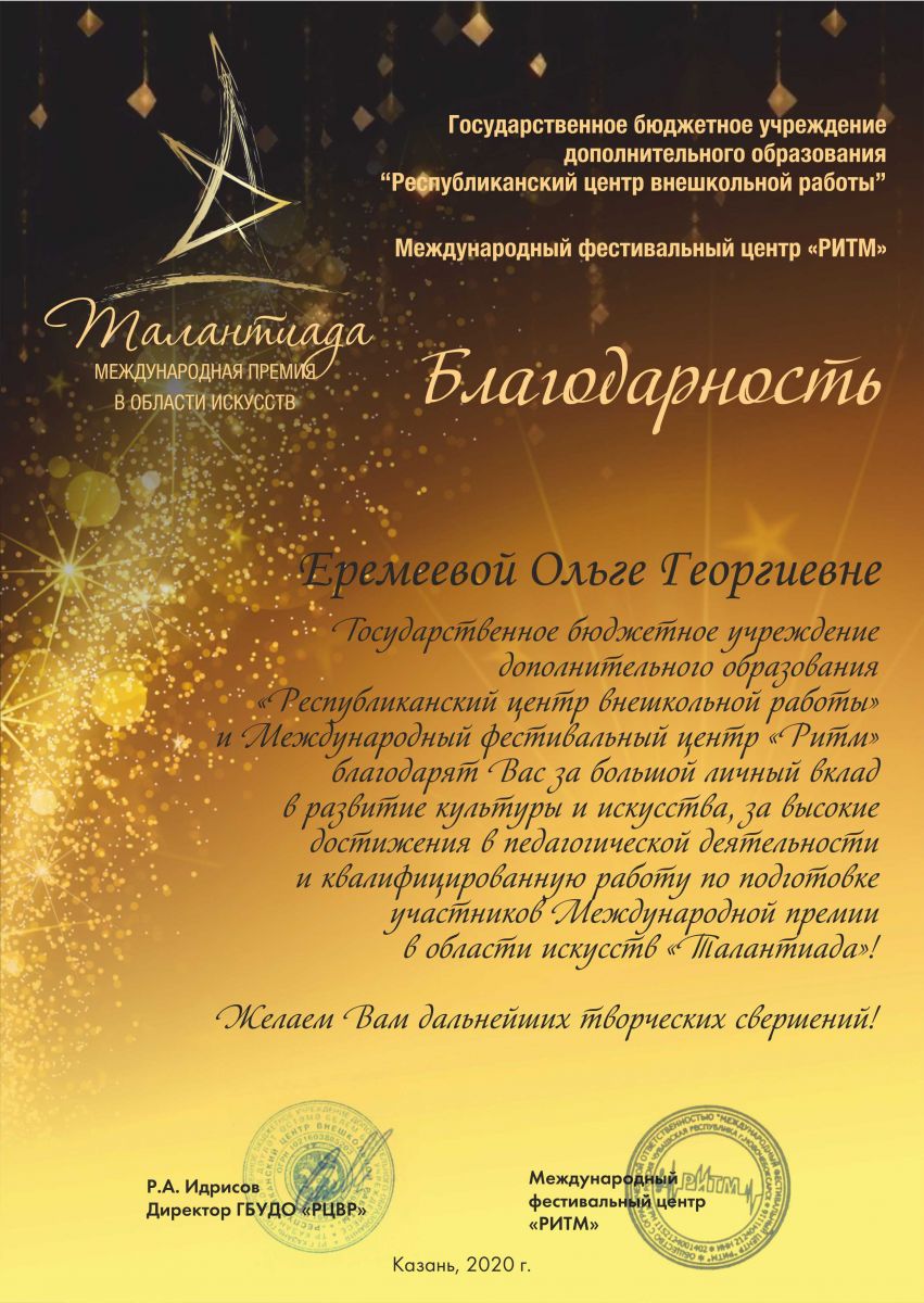 Международный конкурс-фестиваль "Талантиада" - Еремеева О.Г. - Благодарственное письмо