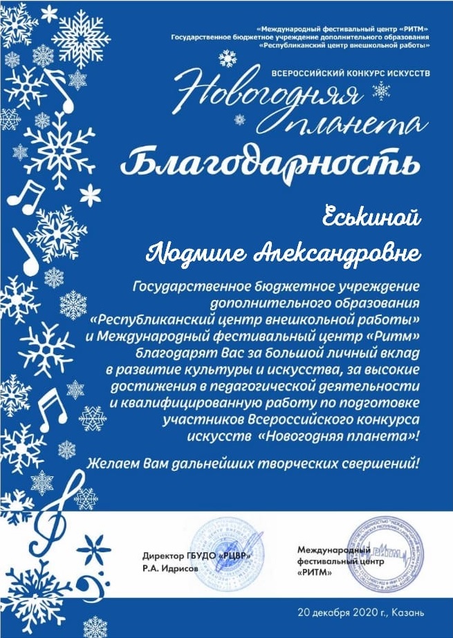 Всероссийский конкурс искусств "Новогодняя планета" - Еськина Л.А. - Благодарственное письмо