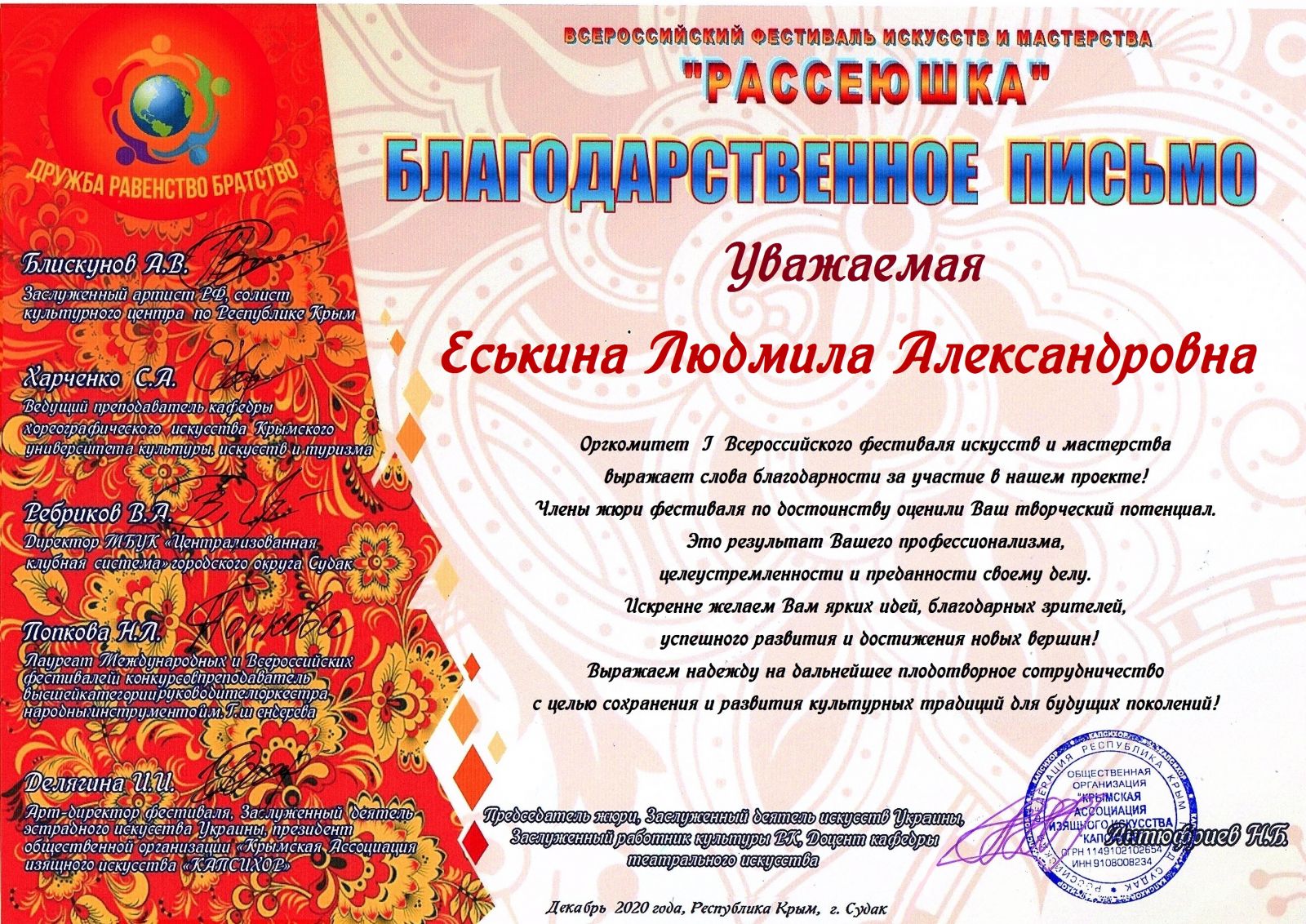 Всероссийский фестиваль искусств и мастерства "РАССЕЮШКА" - Еськина Л.А. - Благодарственное письмо