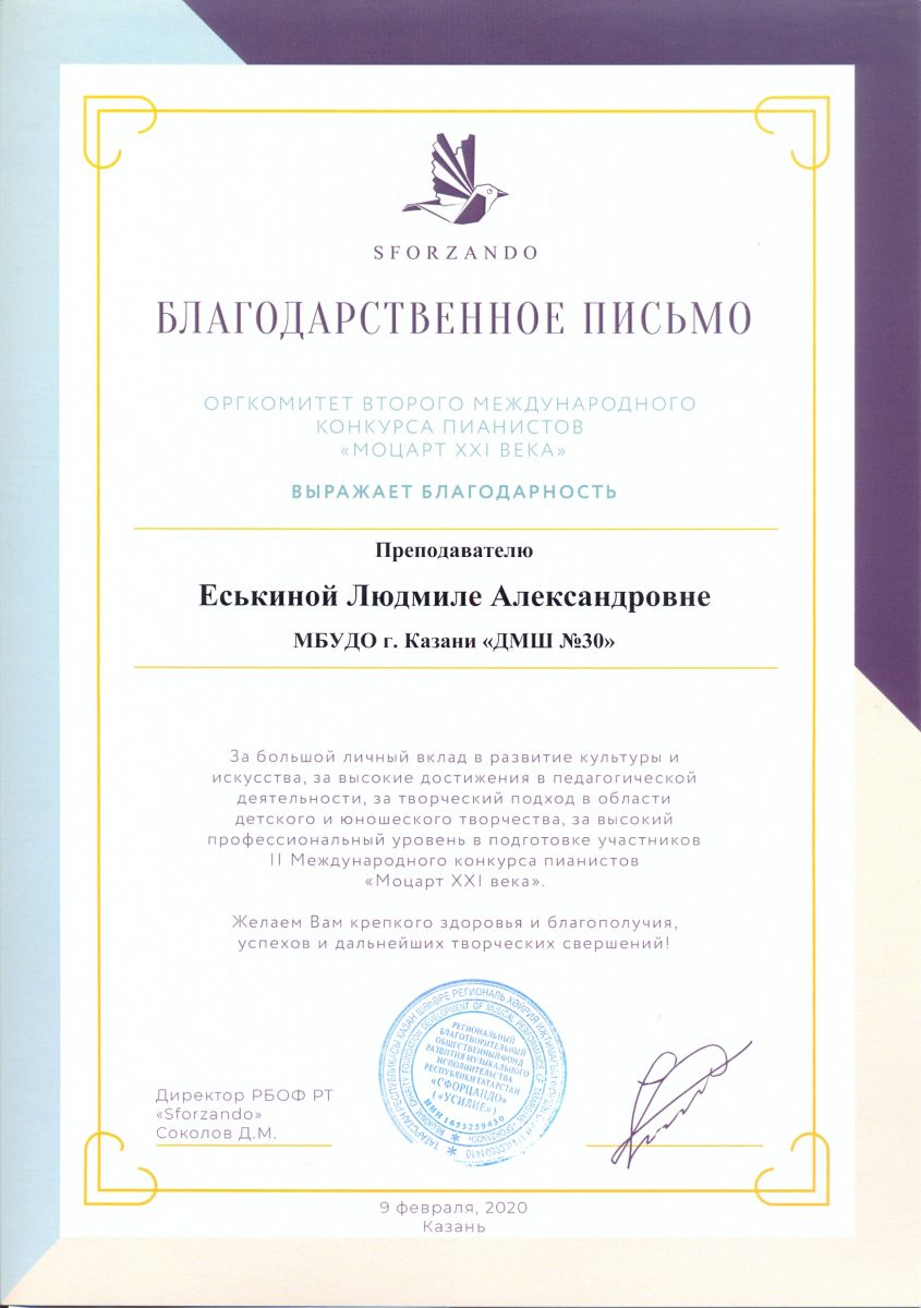 II Международный конкурс пианистов "Моцарт XXI века" - Еськина Л.А. - Благодарственное письмо
