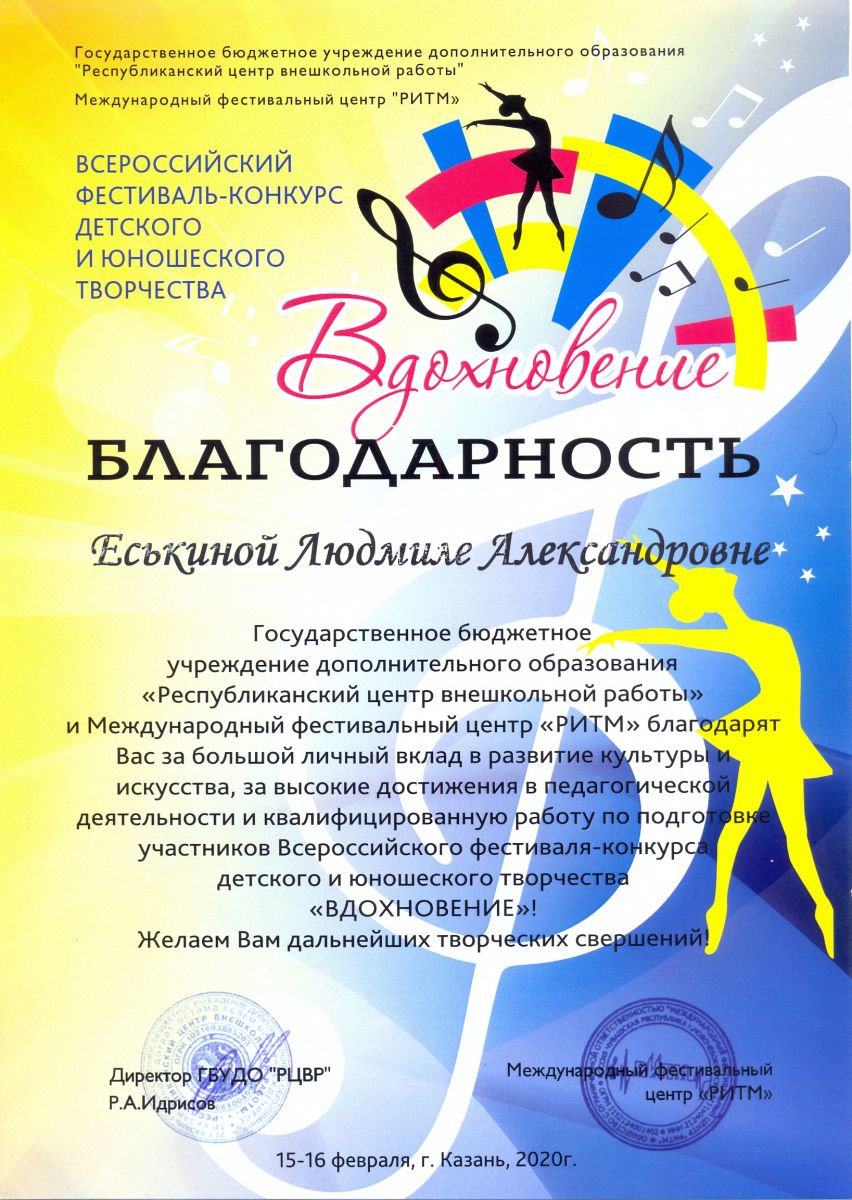 Всероссийский фестиваль-конкурс детского и юношеского творчества "Вдохновение" - Еськина Л.А. - Благодарственное письмо