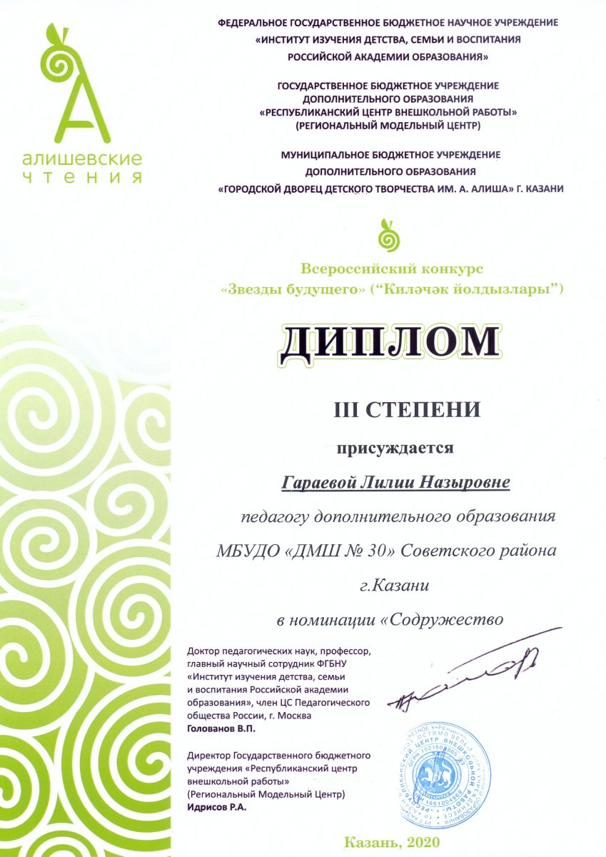 Всероссийский конкурс "Звезды будущего" ("Киләчәк йәлдызлары") в рамках Алишевских чтений - Гараева Л.Н. - диплом III степени в номинации "Содружество"