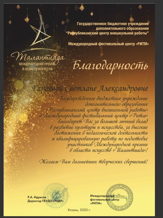 Международный конкурс-фестиваль "Талантиада" - Гараева С.А. - Благодарственное письмо
