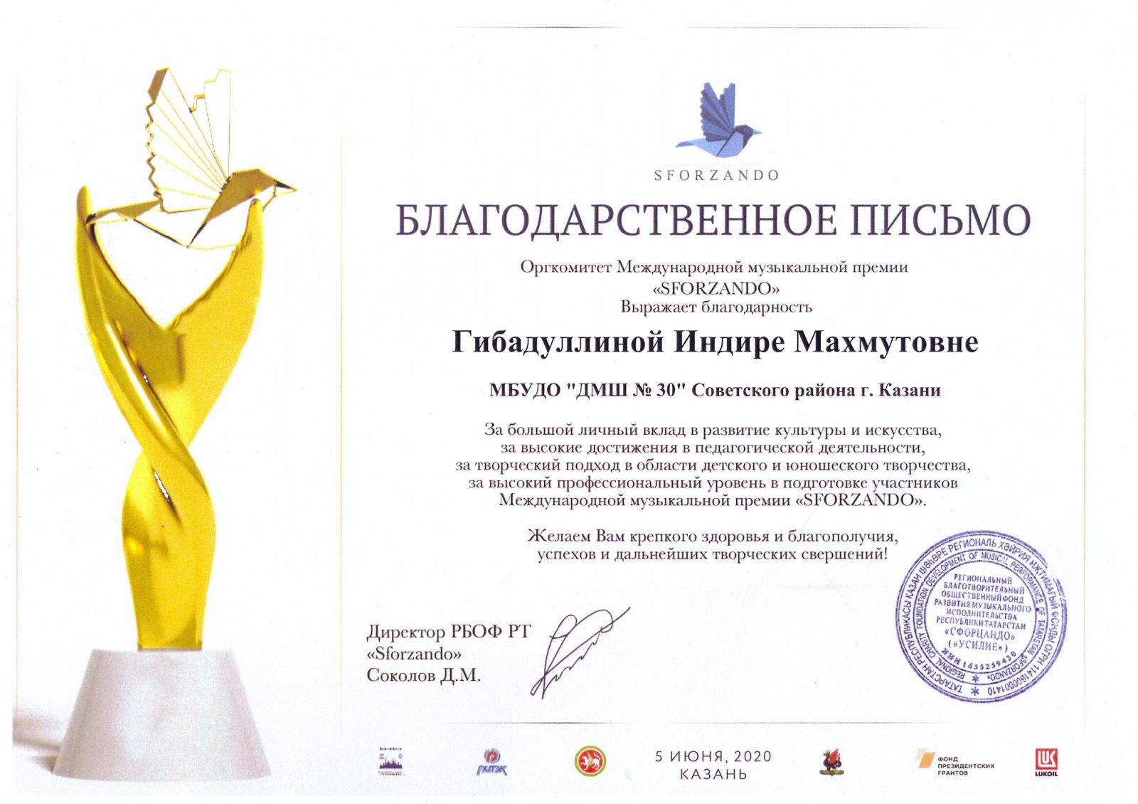 Международная музыкальная премия "SFORZANDO" - Гибадуллина И.М. - Благодарственное письмо
