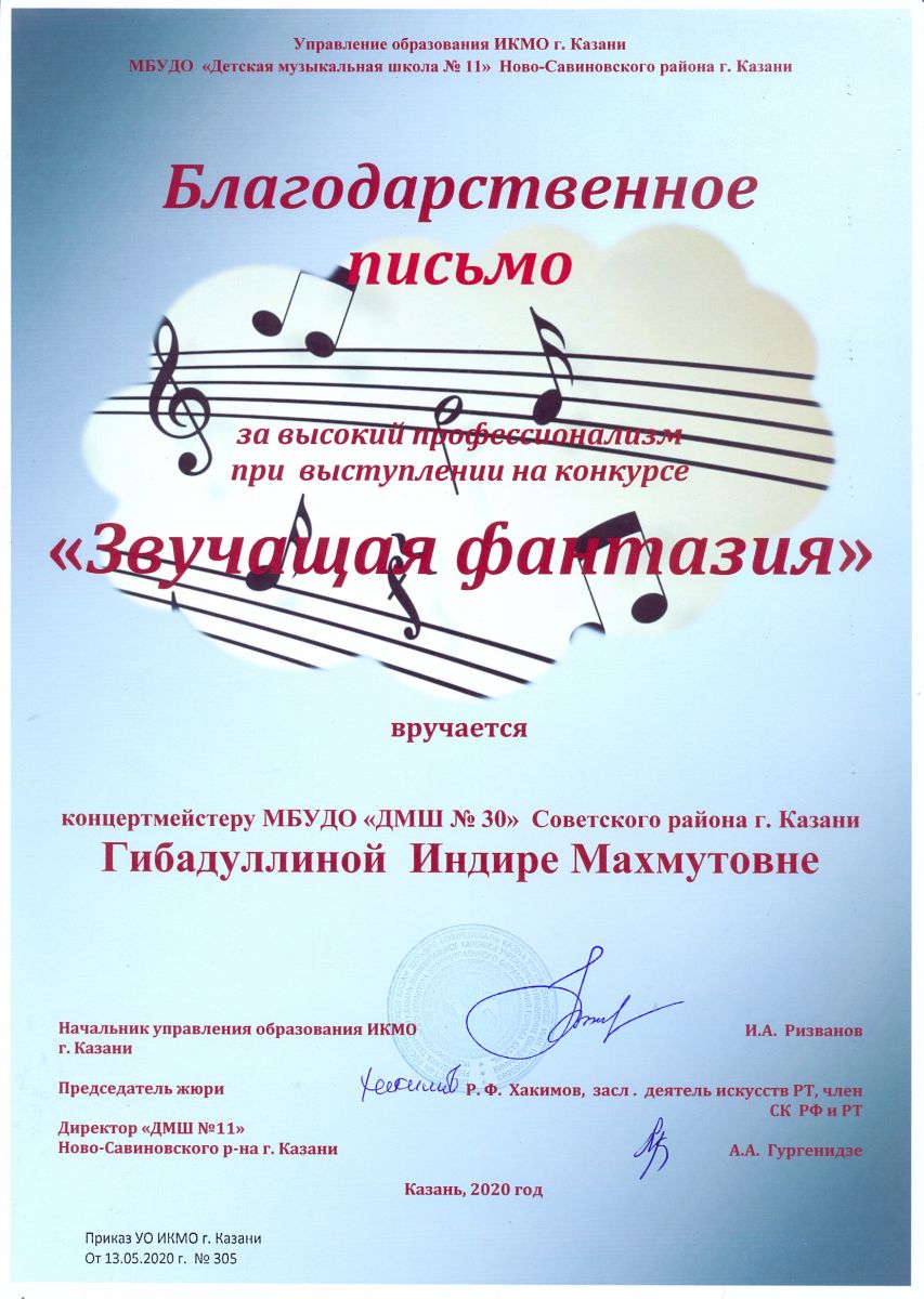 Городской конкурс "Звучащая фантазия" - Гибадуллина И.М. - Благодарственное письмо